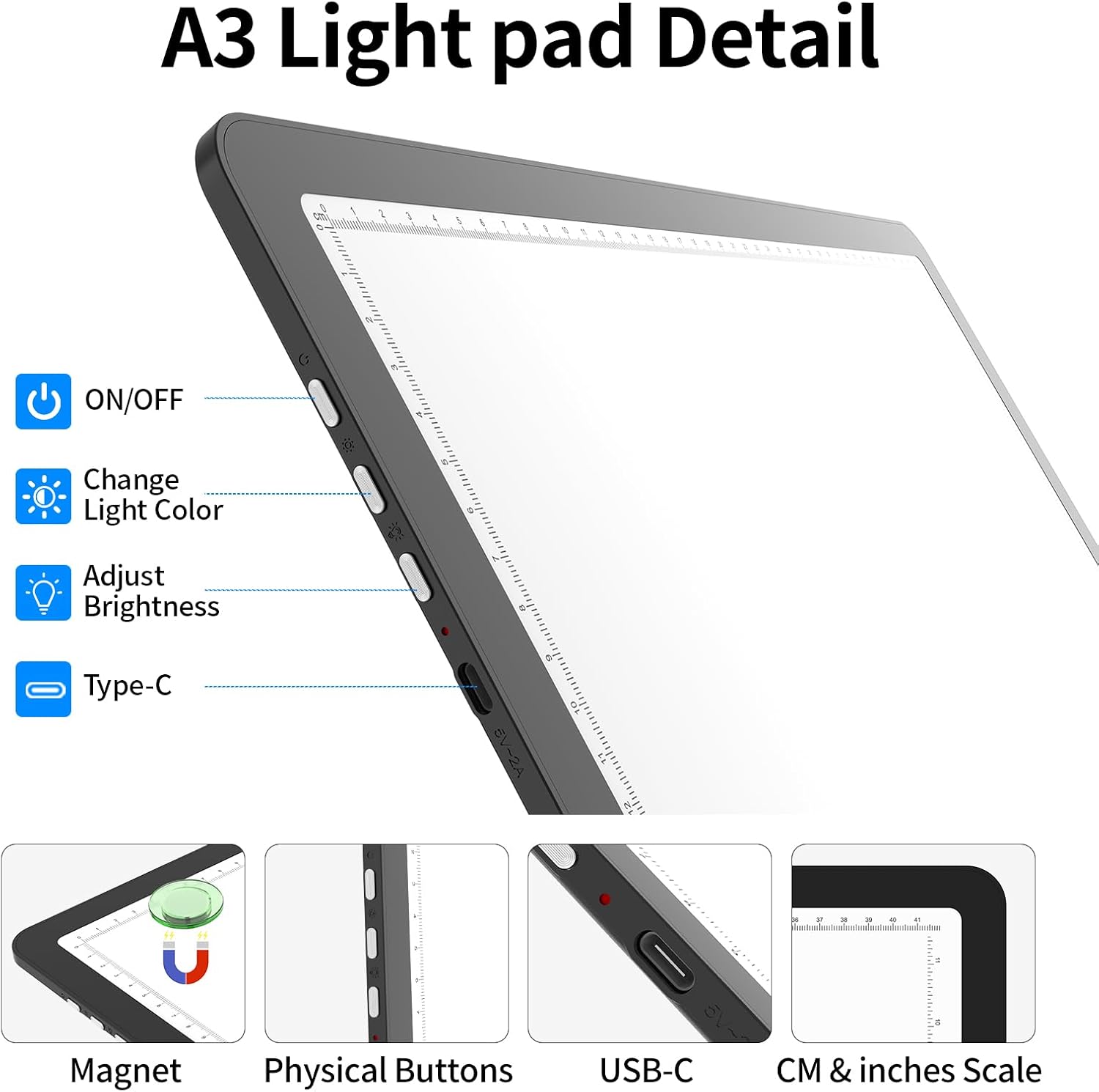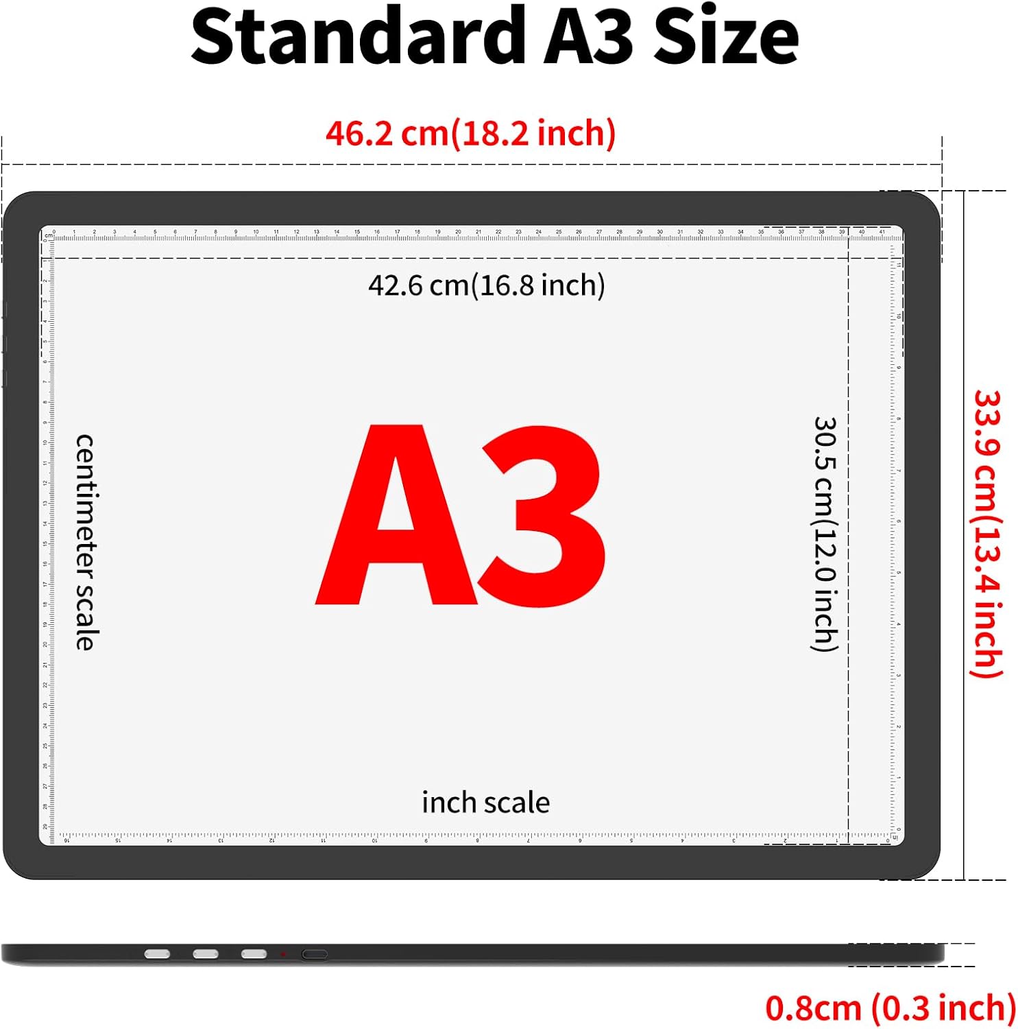 - 【 Standard A3 size, CM-INCH double scale 】 This super bright lightpad Overall Size is 46.2 x33.9 x 0.8 cm ( 18.2 x 13.4 x 0.3 inches ), and the visual working area is 42.6 x 30.5 cm ( 16.8 x 12.0 inches ). Illuminated area large enough for international standard A3 paper. This Light Drawing Sketch Pad has a dual scale of centimeters and inches to meet your various usage habits.