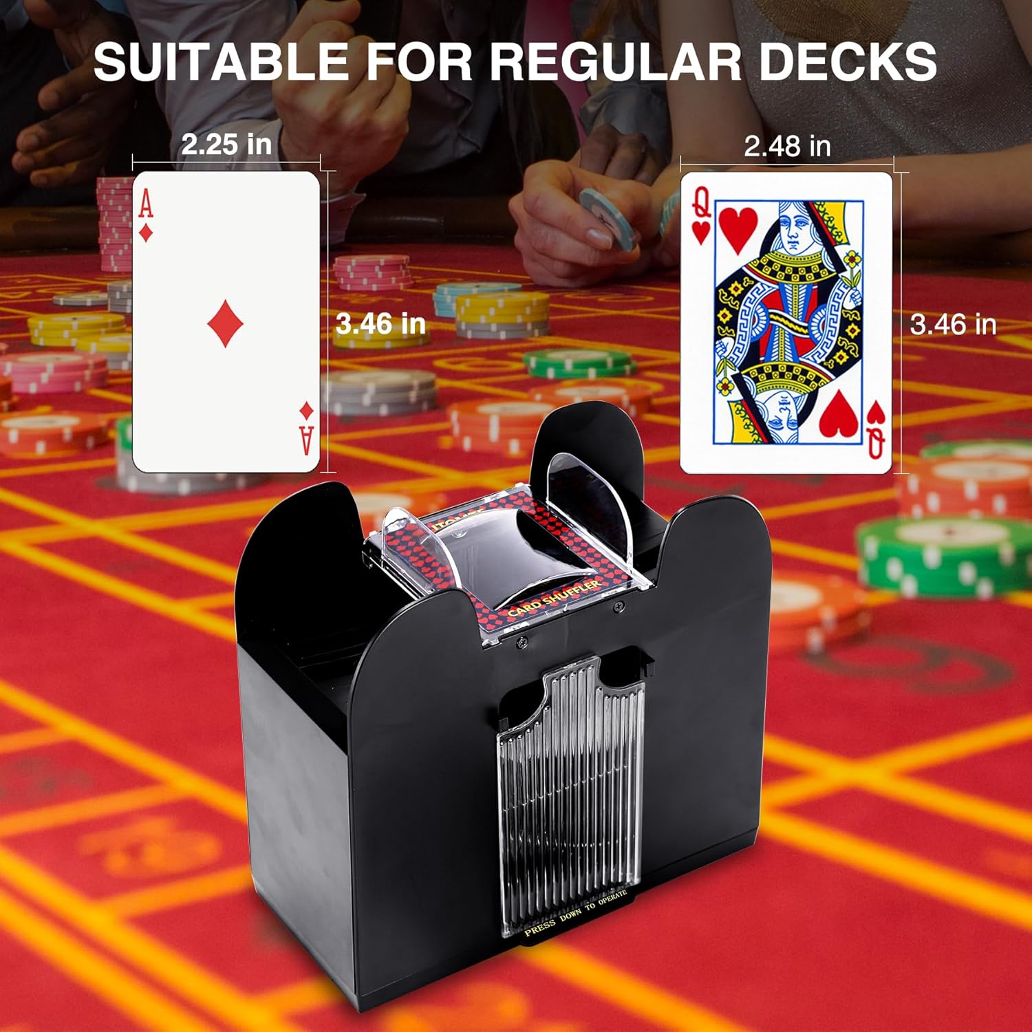 - [Perfect for Various Card Games] The card shuffler 4 deck automatic feature is ideal for UNO, poker games,travel games, while the 6-deck capacity makes this model versatile for large, high-stakes games. Its automatic card shuffler and dealer function eliminates the hassle of manual dealing, offering seamless card distribution and a smoother game experience.This card shuffler 2 deck can be used as casino equipment .
