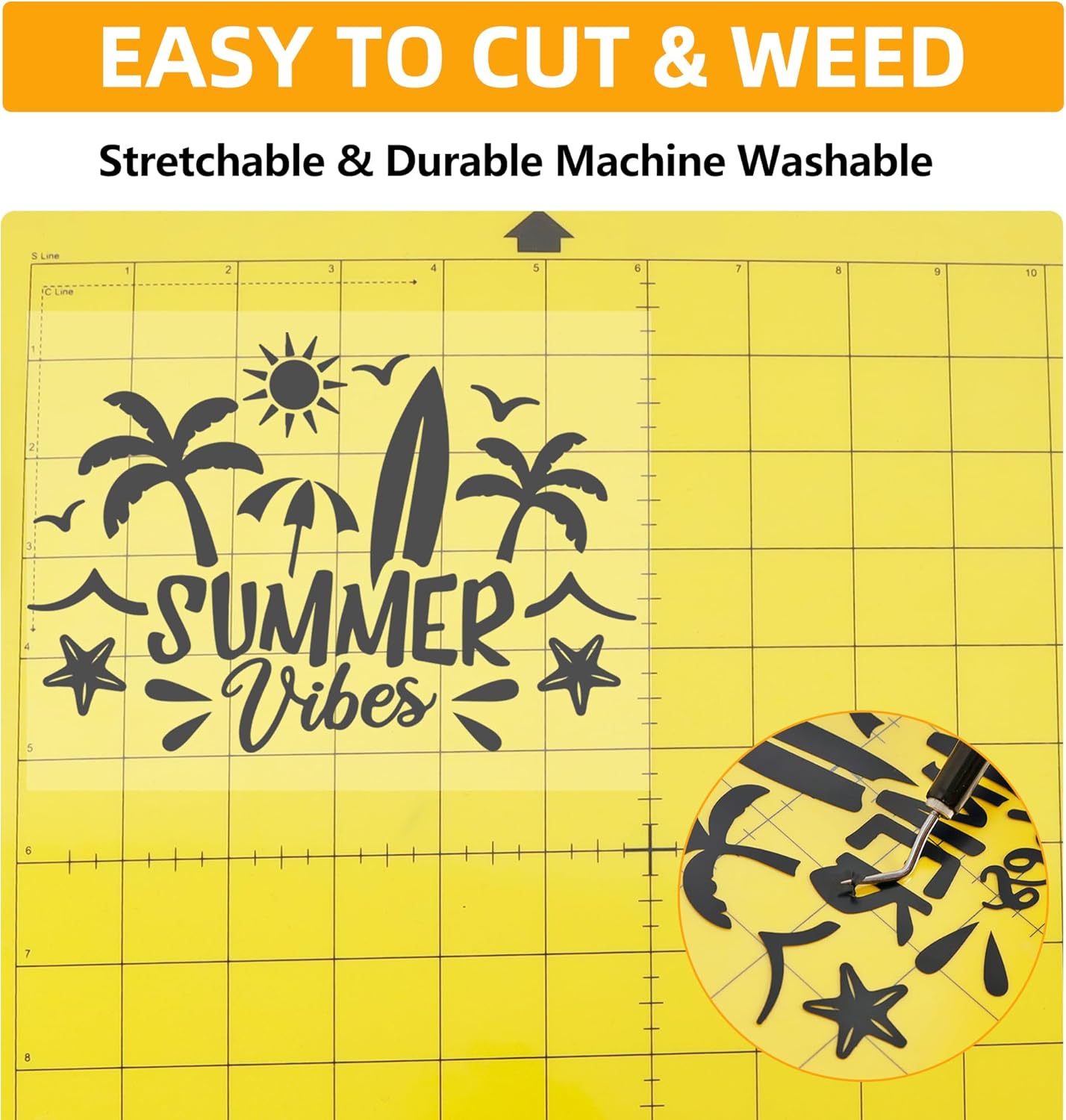 - EASY TO CUT & WEED & TRANSFER: Our htv vinyl is sensitive to temperature and pressure, which can be quickly and easily to weed and peel. It is compatible with all cutter machines, most heat presses and household irons on the market, and perfect for 12x12" and 12x24" cutting mats. You can easily apply adhesive backing htv to fabric using a hot iron or hot press. Please note that it is warm peel