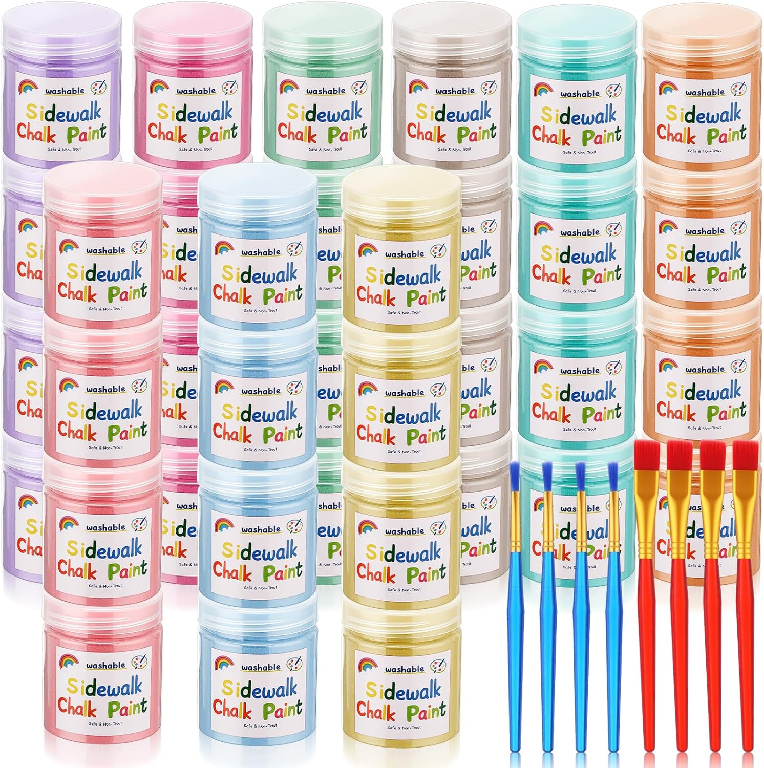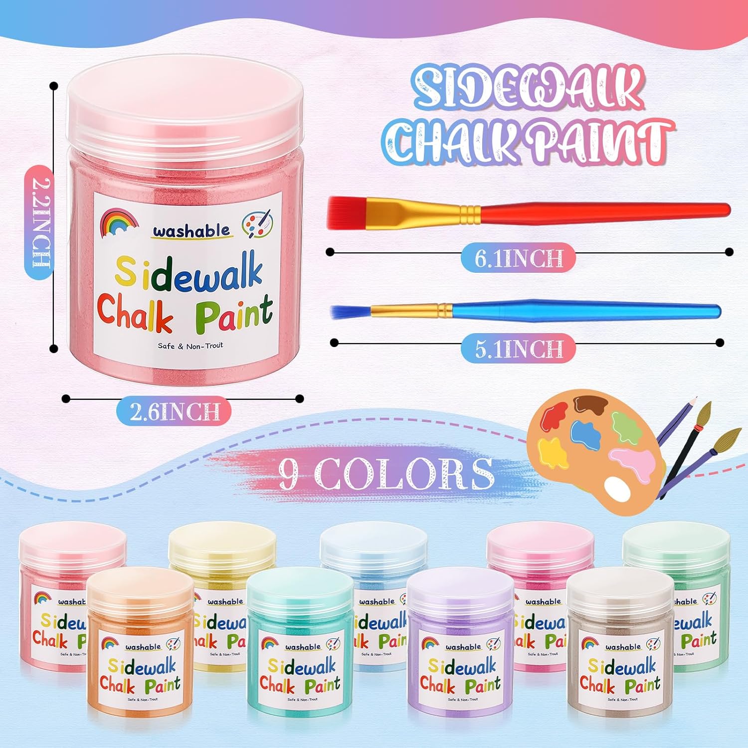 - Sidewalk Chalk Paint Set: this sidewalk chalk paint set includes 9 non-toxic, washable powdered chalk; Just mix with water to create custom chalk paint, and use the two included paintbrush sizes to express your creativity outdoors