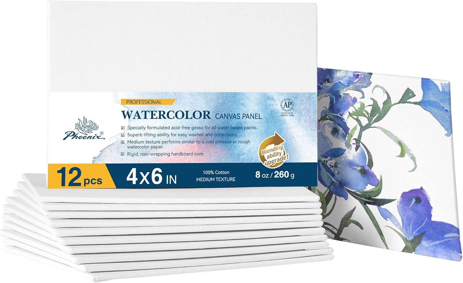 PHOENIX Watercolor Canvas Boards for Painting - 4x6 Inch/12 Pack, 100% Cotton Water Color Small Canvas Panels, 8 Oz. / 260g White Blank Medium Texture Flat Canvases for Water Based Paints