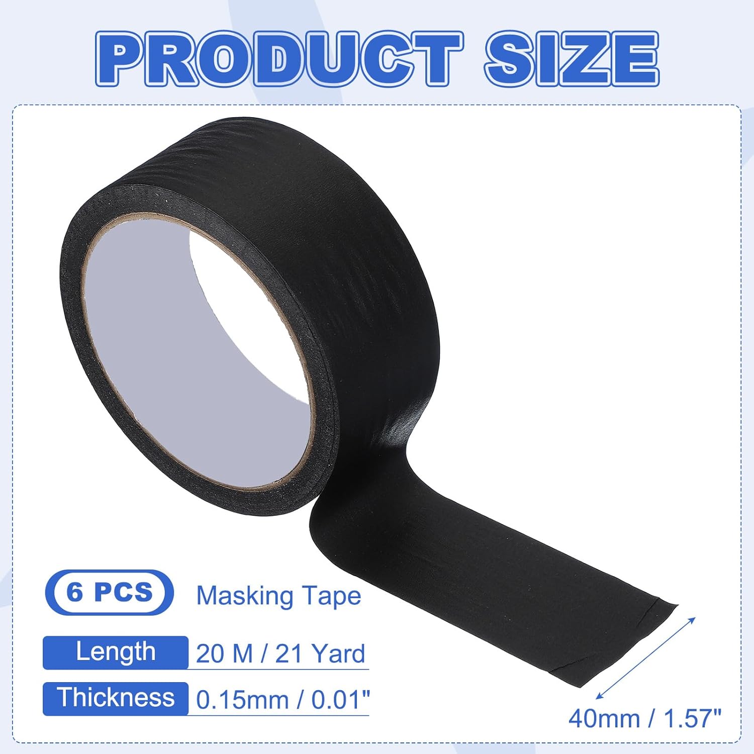 - The masking tape, provides here,is in size of: Thickness: 0.15mm(0.01inch); Size: 40mm x 20m(1.57inch x 21Yard); Color: Black; Material: Crepe Paper In the package of: 6 Pack x Masking Tape
