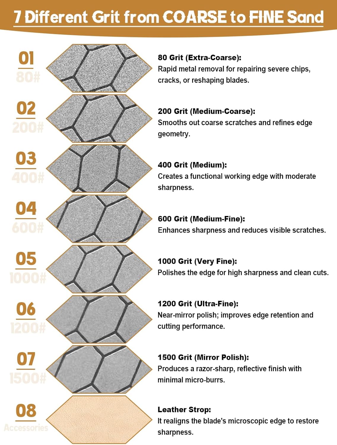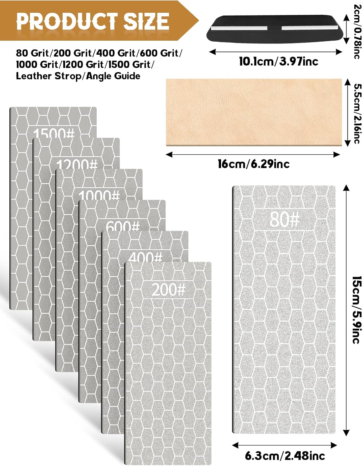 - Package Include: You will receive 7 pieces knife sharpener stones in different styles, including 80 grit, 200 grit, 400 grit, 600 grit, 1000 grit, 1200 grit and 1500 grit, together with a leather strop and a angle guide. These whetstones are small in size and light in weight, so they are easy to carry and store without taking up too much space.