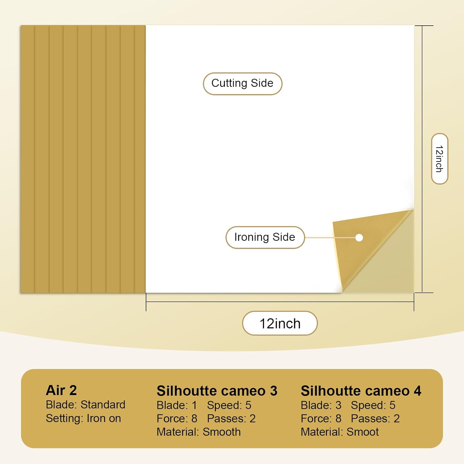 - 【CUSTOMIZABLE & USE WIDELY】12" × 12" pre-cut size Gold Iron on Vinyl Sheet is suitable for use with most popular cutter machines and cutting mat. Our quality HTV Vinyl Bundle can be used to create stunning projects on a wide variety of fabrics such as including 100% Cotton, Cotton/Polyester Blends and even Athletic Mesh fabrics! Personalize your custom t-shirts, tote bags, caps, aprons, pillows and more with our Vinyl HTV