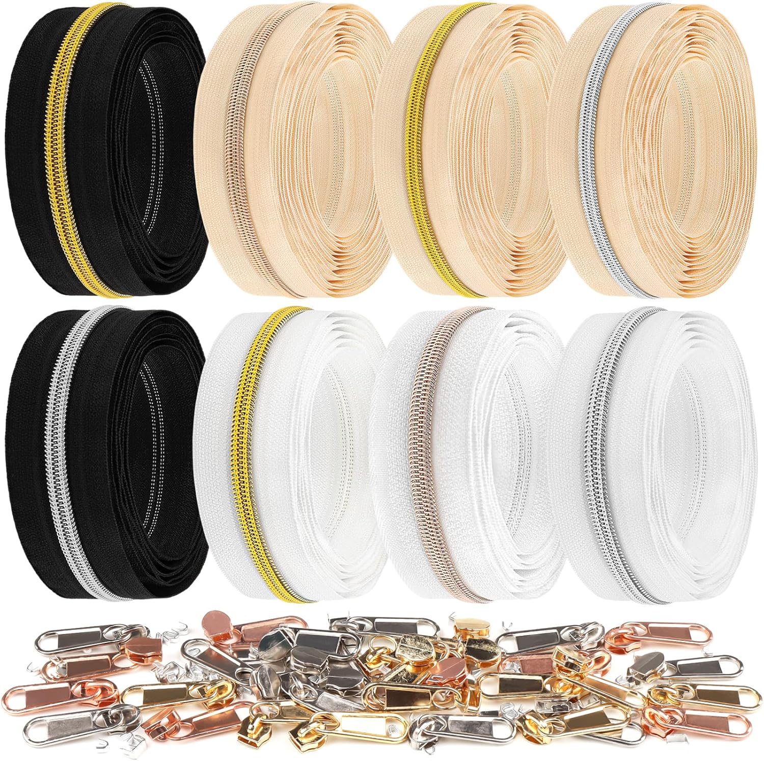 DOITEM 17.8 Yards Endless Zippers by The Meter Black White Zipper 6 mm Spiral + 32 Nonlock Zippers (Gold Silver Rose Gold)
