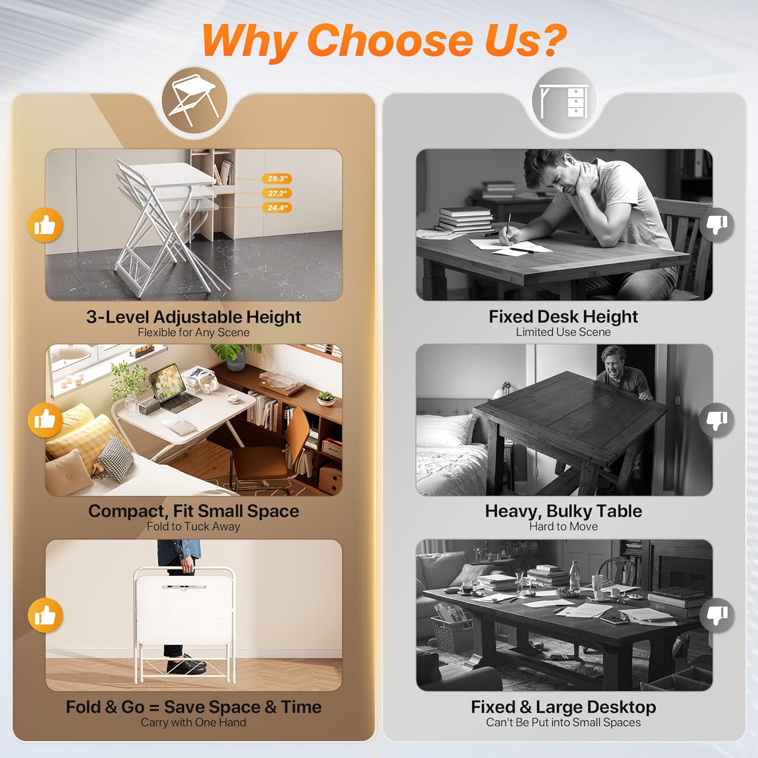 - ăSturdy & Durable BuildăStrong steel frame, adjustable feet, and cross-leg design of the portable folding desk provide exceptional stability. The water-resistant, scratch-resistant tabletop blends seamlessly with any home decor â perfect for bedrooms, apartments, RVs, offices, and more