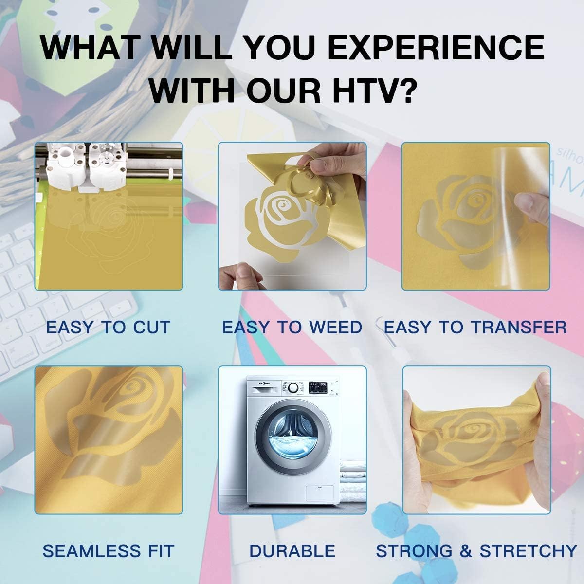 - 【Easy to Cut & Weed & Transfer】HTVRONT premium quality gold htv vinyl will save time which you may waste on each image or letter, because you can cut and weed easily through the designs just right. Iron on vinyl is sensitive to temperature and pressure, which can be heat transferred to any t-shirt easily. Before cutting, make sure the blade is clean and sharp, so that your design can be cut well and weeding can be done better