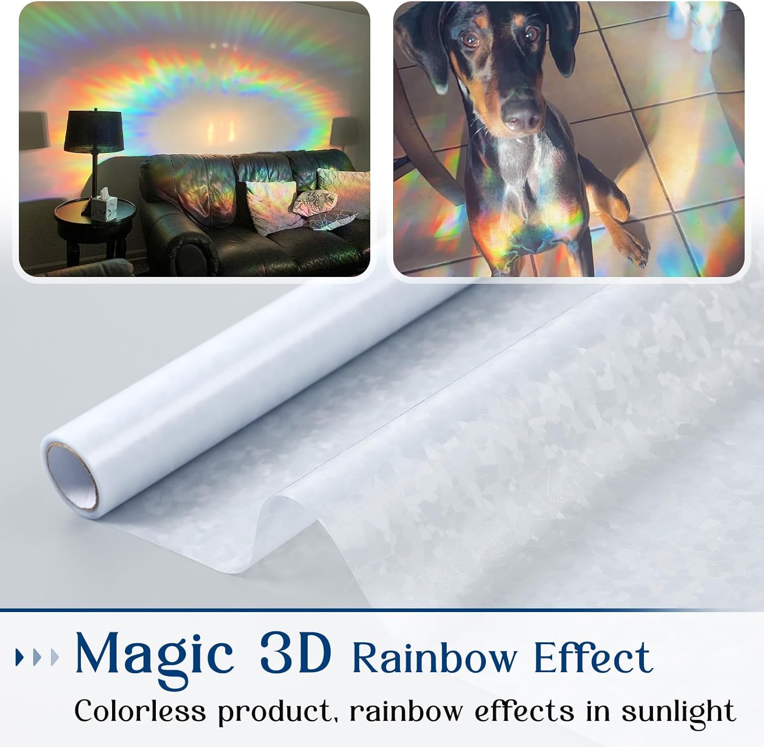 - Stunning Rainbow Effect: Featuring advanced 3D laser etching, this window film creates a vivid rainbow pattern under sunlight, adding playful color to your space—no need for traditional stained glass. Note: The film itself is colorless