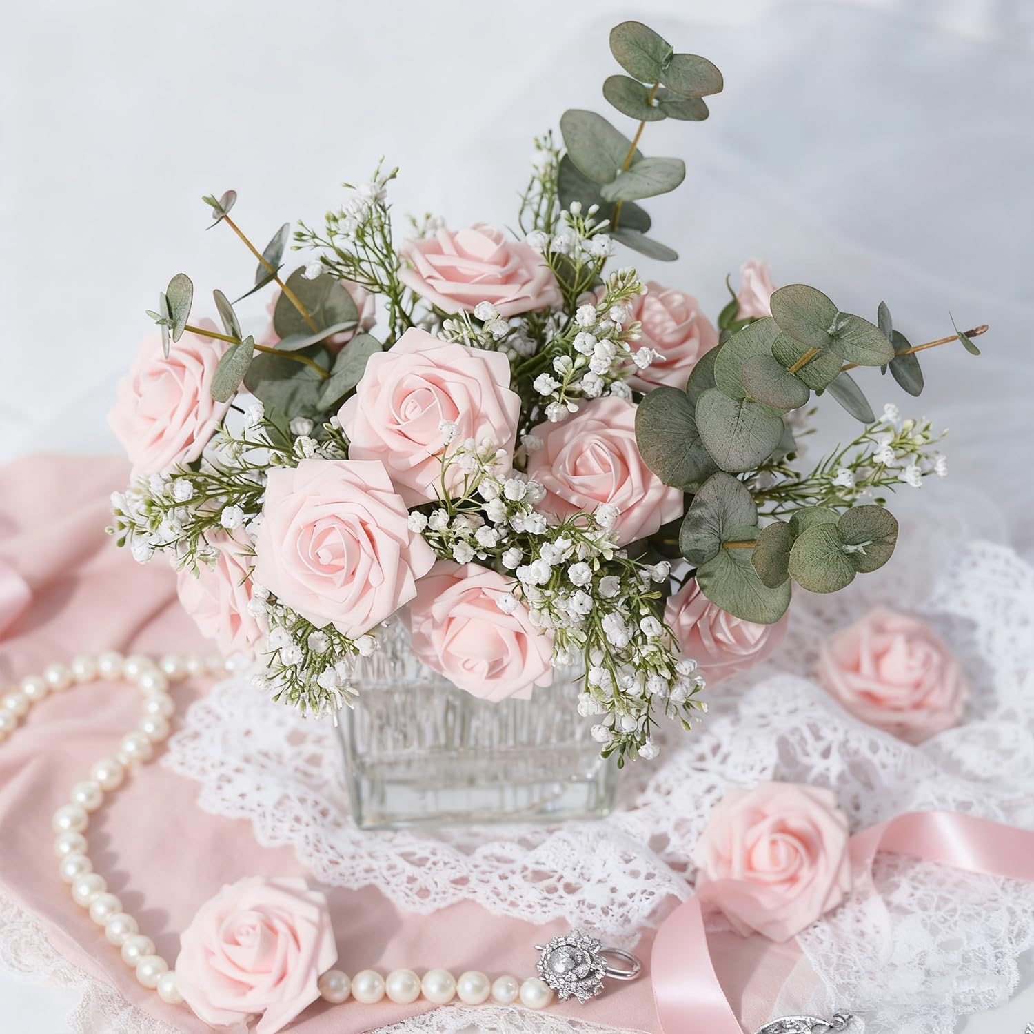 Artificial Flowers Foam Fake Roses 25pcs Light Pink Roses with Stems for Home Decor DIY Wedding Bouquets Party Bridal Shower Centerpieces Faux Flower Arrangements Tables Decorations