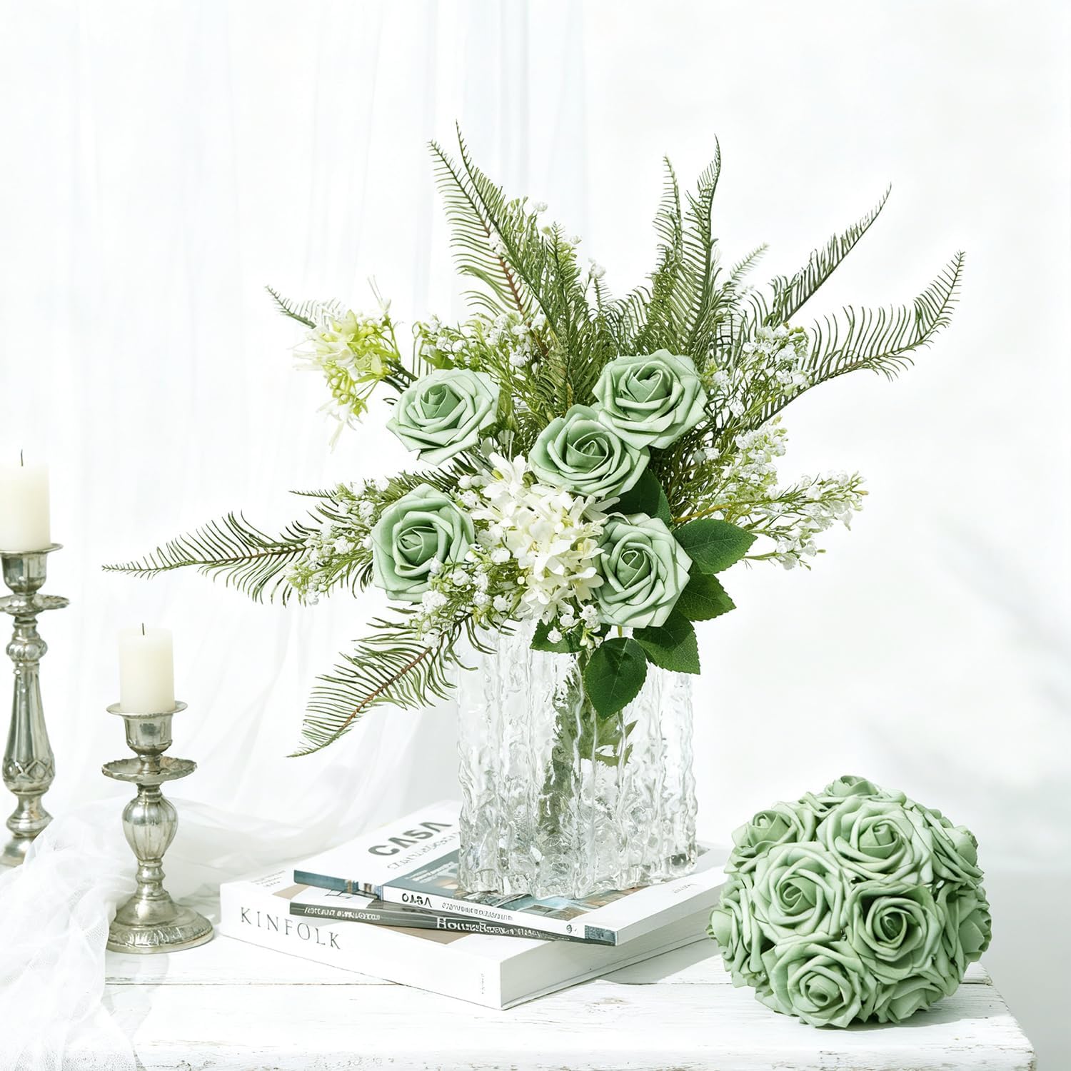 Artificial Flowers Foam Fake Roses 25pcs Green Roses with Stems for Home Decor DIY Wedding Bouquets Party Bridal Shower Centerpieces Faux Flower Arrangements Tables Decorations