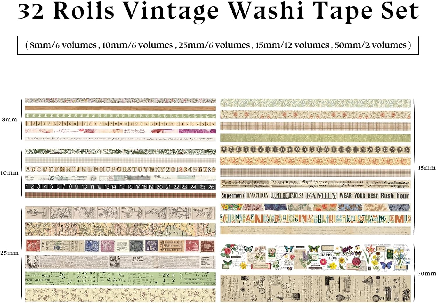 32 Rolls Vintage Washi Tape, Aesthetic Colored Decorative Cute Scrapbook Tape for Scrapbooking Supplies Journaling Craft Junk Journal