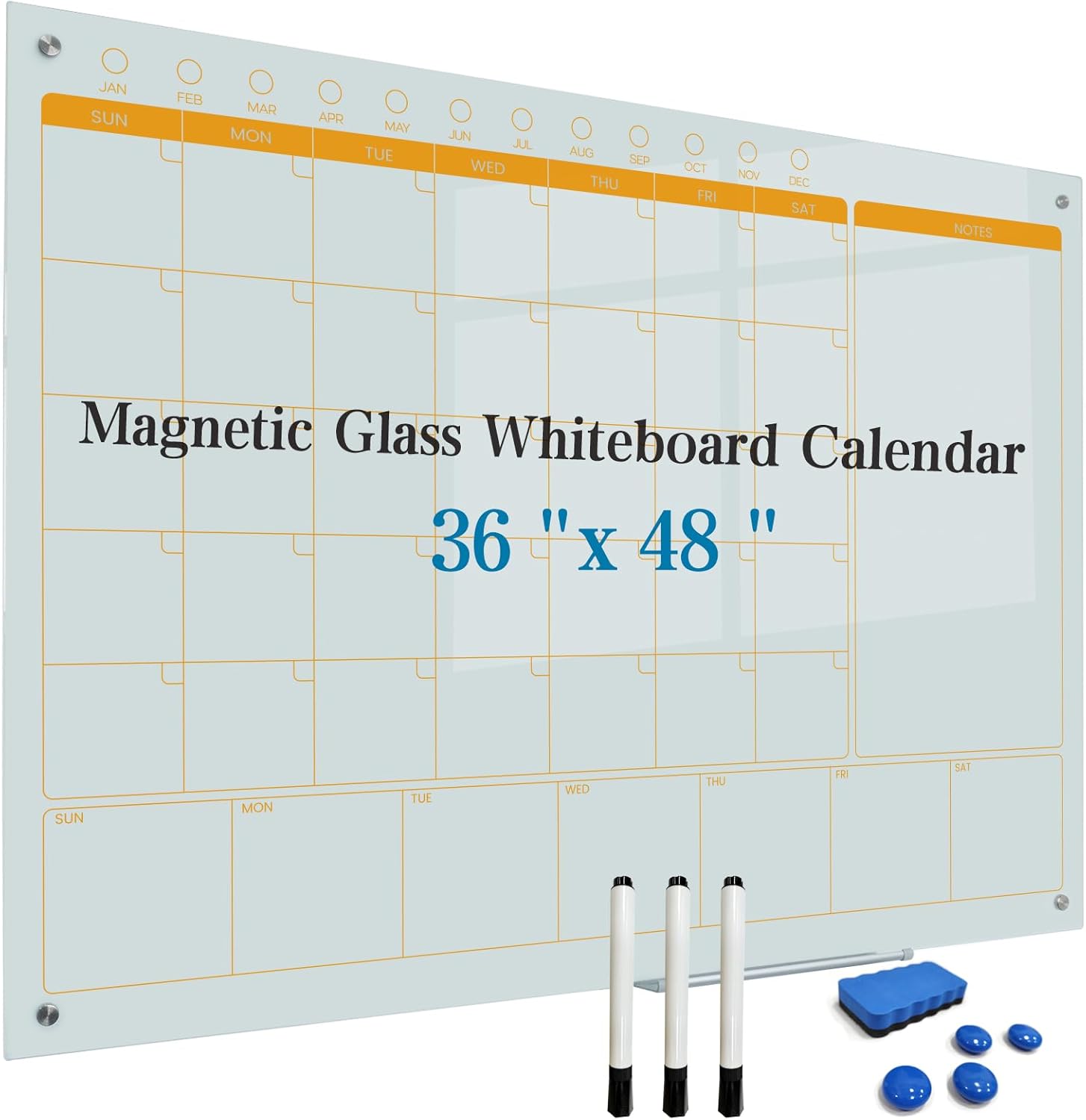 Magnetic Glass Whiteboard Calendar 48"x36" Glass Dry Erase Calender Board 36"x48" Monthly Plan White GlassBoard Wall Mounted for Office School Home (White)