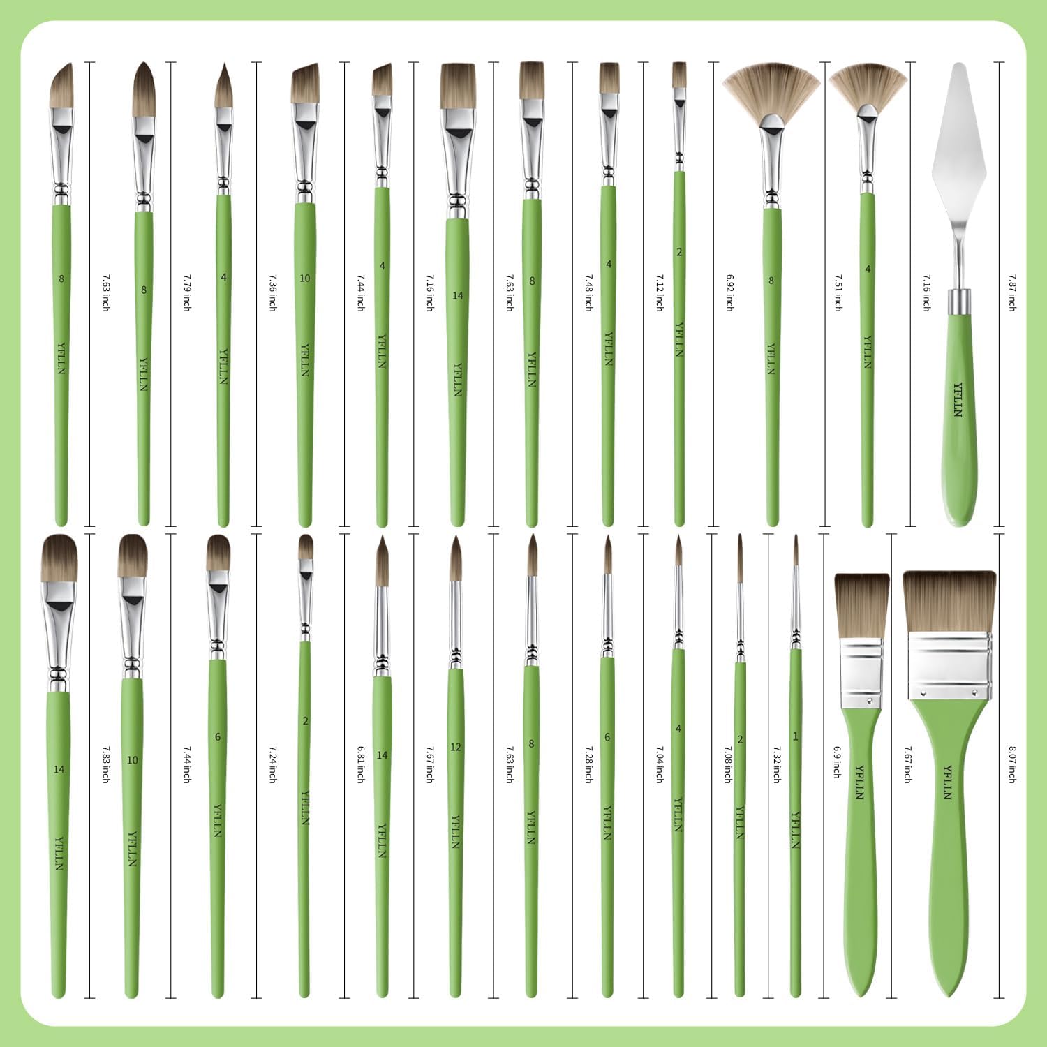 - Variety of Shapes & Sizes: Paint brushes for acrylic painting set includes 24 brushes (Large Wide Flat, Flat, Filbert, Fan, Dagger, Cat Tongue, Round, Angle, Rigger), 1pc palette knife, 1pc portable canvas roll. A selection of sizes allows you to bring your vision to life on a large scale, in tiny detail, or anything in between.