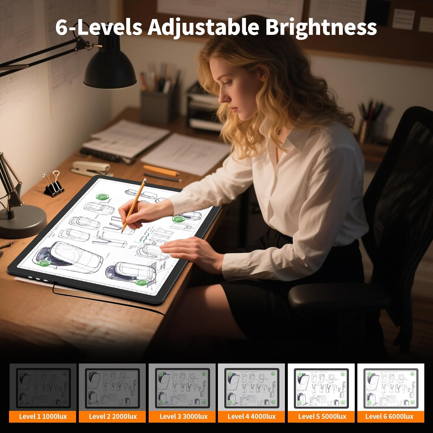 - 【 3 Colors Light and 6 Levels Adjustable Brightness 】 This A3 Tracing light box are available in three lighting modes, white color, normal color or warm color, each with choice of 6 adjustable brightness levels.
