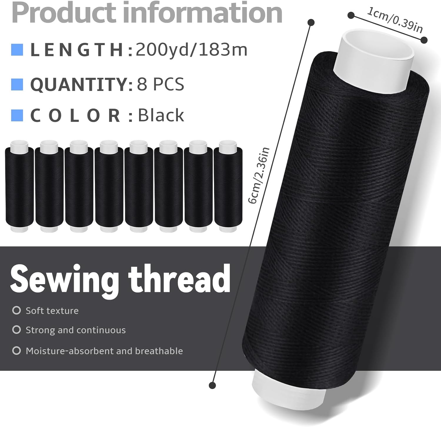 Bupete 8 Rolls Black Thread for Sewing, 200 Yards Each Roll Sewing Thread, Polyester Threads for Sewing Machine Embroidery Hand Stitching