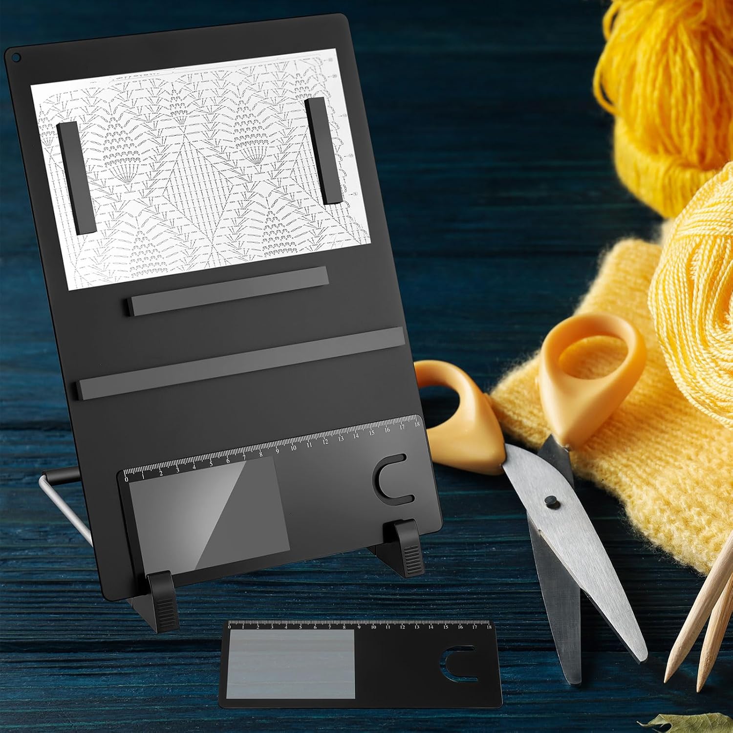 Flutesan 8 Pcs Cross Stitch Accessories and Tools 11.5 x 4.7 Inch Metal Magnet Board Chart Knitting Pattern Holder 2 Bookmark Magnifier with Ruler 1 Bracket 4 Magnet Strips for Crafts Work (Black)