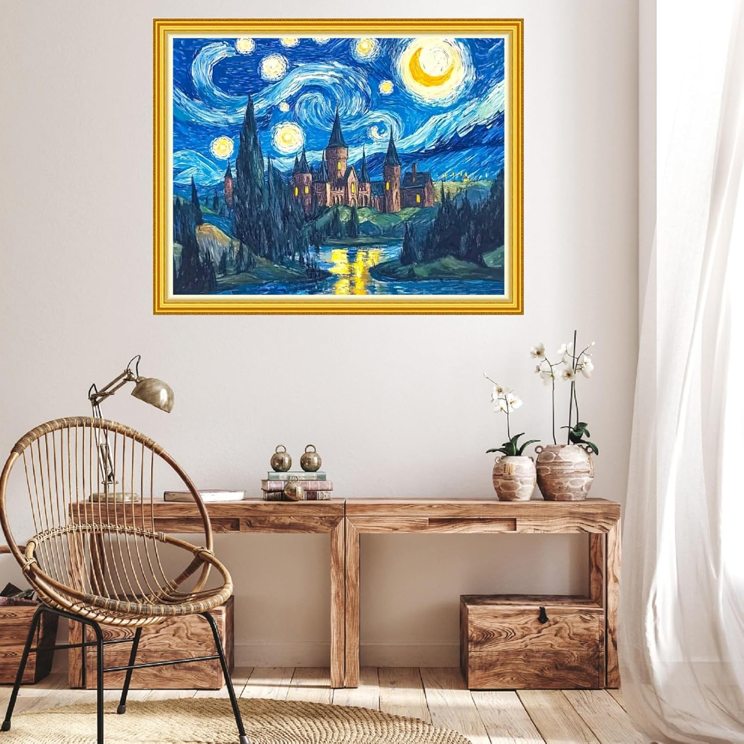 Hopeart Stamped Cross Stitch Kits for Beginner Embroidery Kits for Beginners Adults DIY 11CT Cross Stitch Patterns Needlepoint Kits Crossstitching Kits-Van Gogh's Starry Moon Castle 16x20 inch