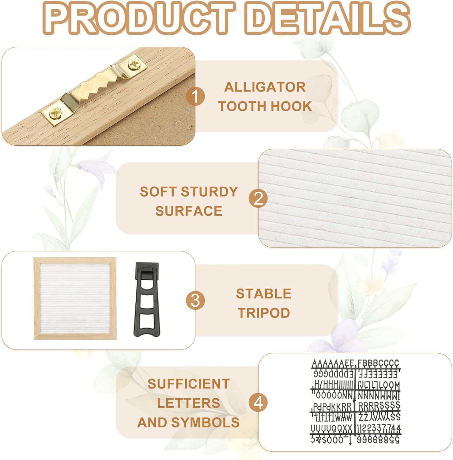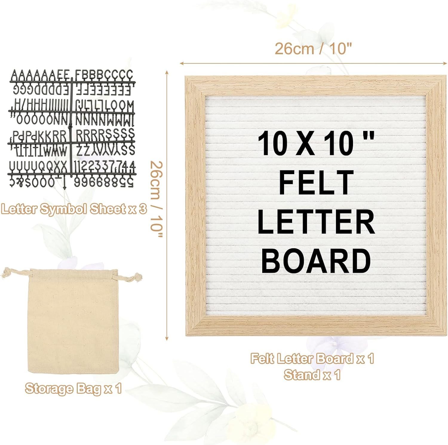 - Material: Wood, Felt, Plastic;Board Color: White Wood;Letter Color: Black;Size: 26x26cm / 10x10";Installation Method: Hanging, Stand Supported;Accessories: Storage Bag, Stand;Package Includes: Message Board x 1, Letter Set x 3, Storage Bag x 1, Stand x 1