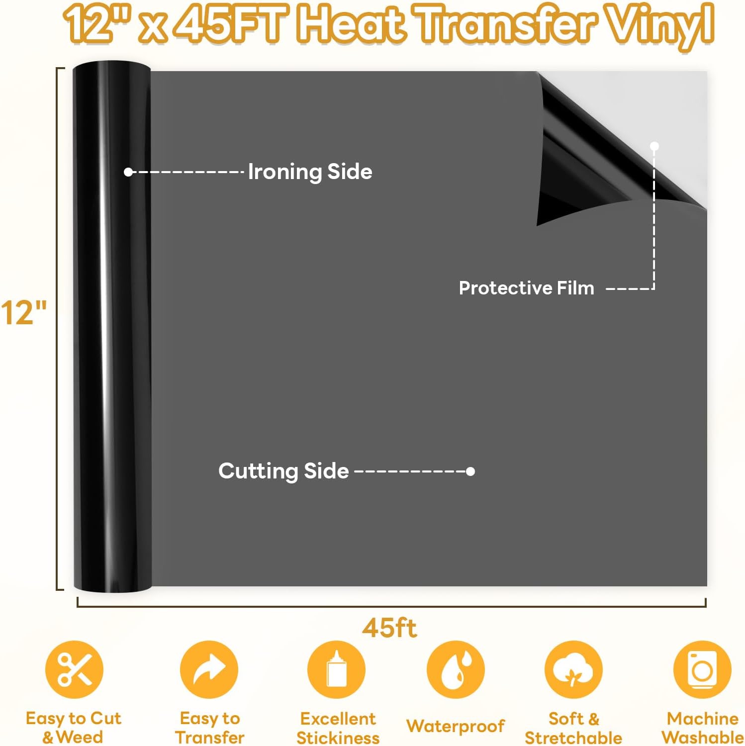 - 【12 inches x 45 Feet】Our black heat transfer vinyl provides 45 feet continuous material (12" wide), offering the best value for crafters. Get the lowest cost per foot compared to small packs, perfect for bulk projects. Our black htv works flawlessly with all cutting machines for seamless crafting experience
