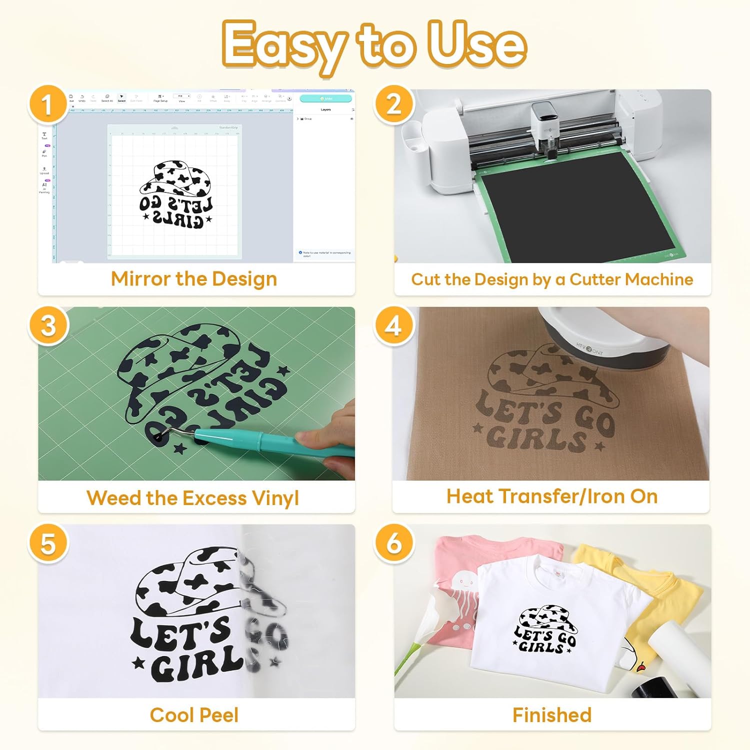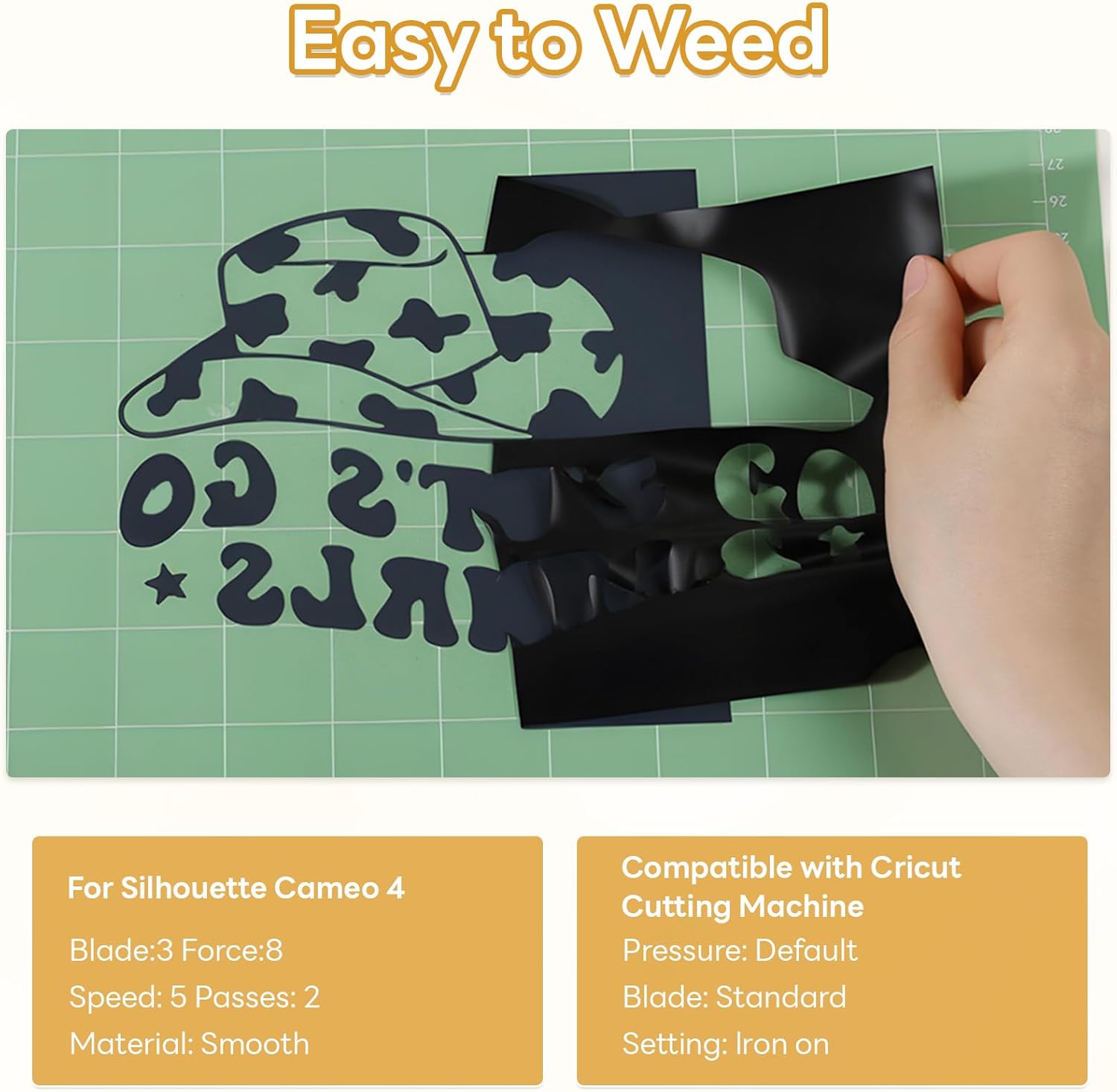 - 【EASY TO CUT & WEED & TRANSFER】 Our premium quality black iron on vinyl will save your time which you may waste on each image or letter, because you can cut and weed easily through the designs just right.The black htv vinyl is sensitive to temperature and pressure, which can be heat transferred on any t-shirt easily