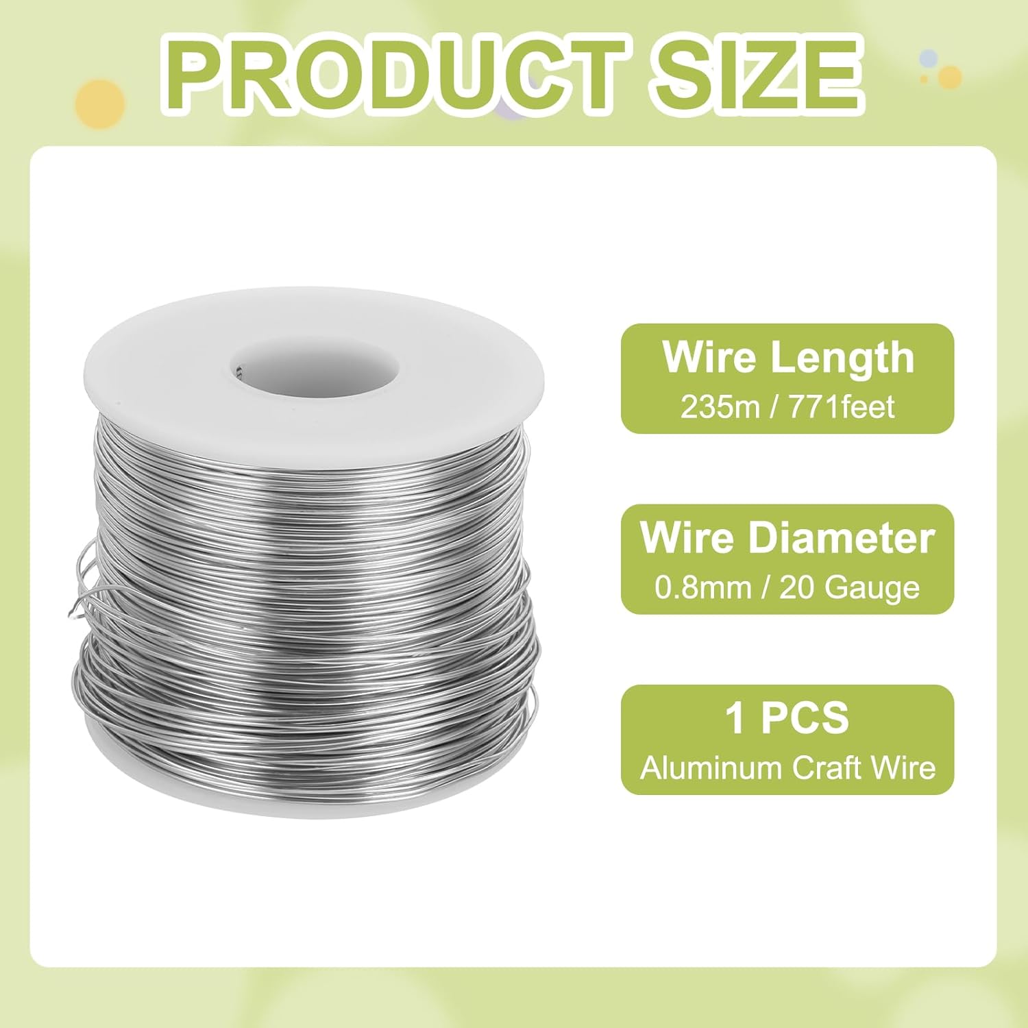 - Package contains 1pcs x Aluminum Craft Wire, wire diameter: 20 Gauge (0.8mm), wire length: 771 Feet (235m)