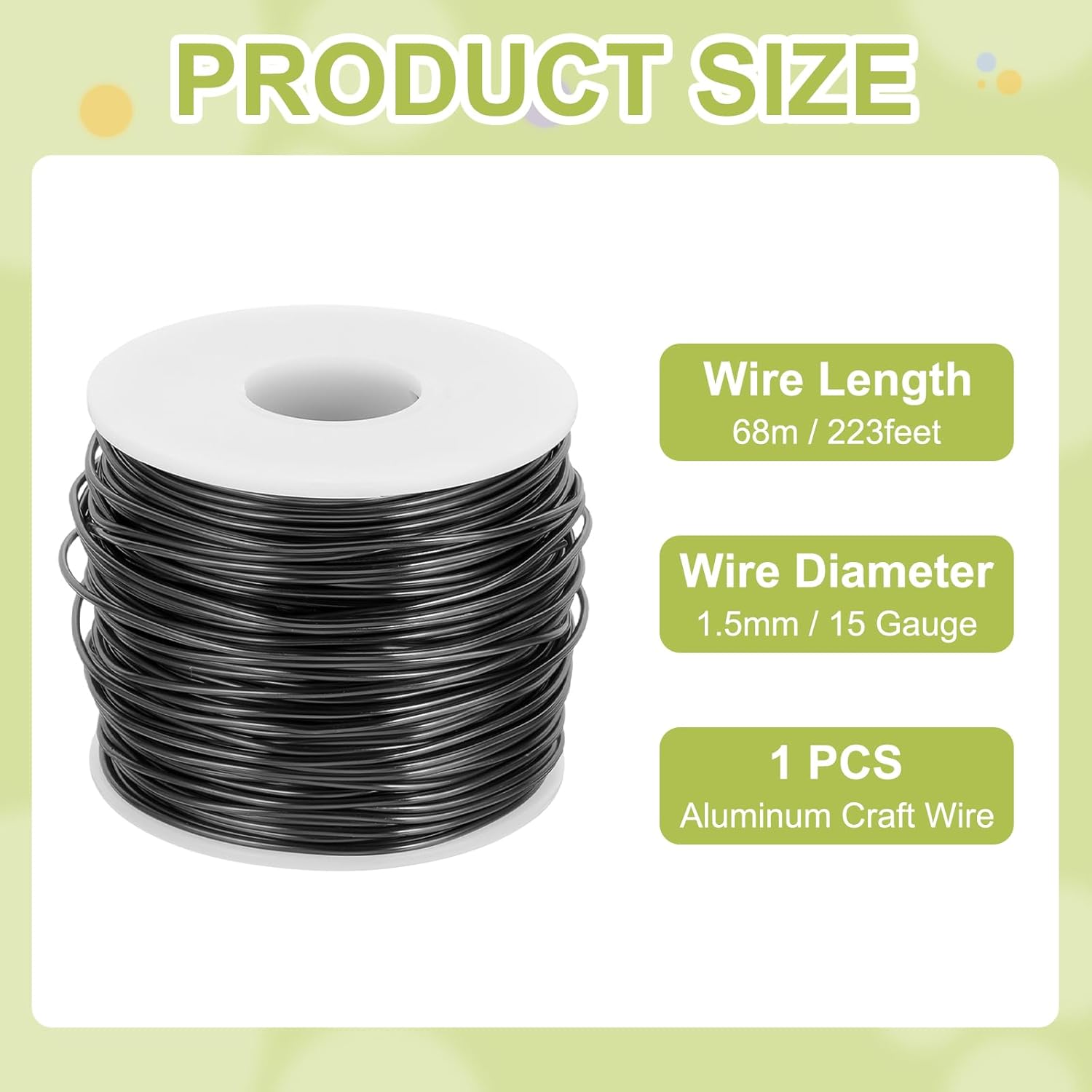 - Package contains 1pcs x Aluminum Craft Wire, wire diameter: 15 Gauge (1.5mm), wire length: 223 Feet (68m)