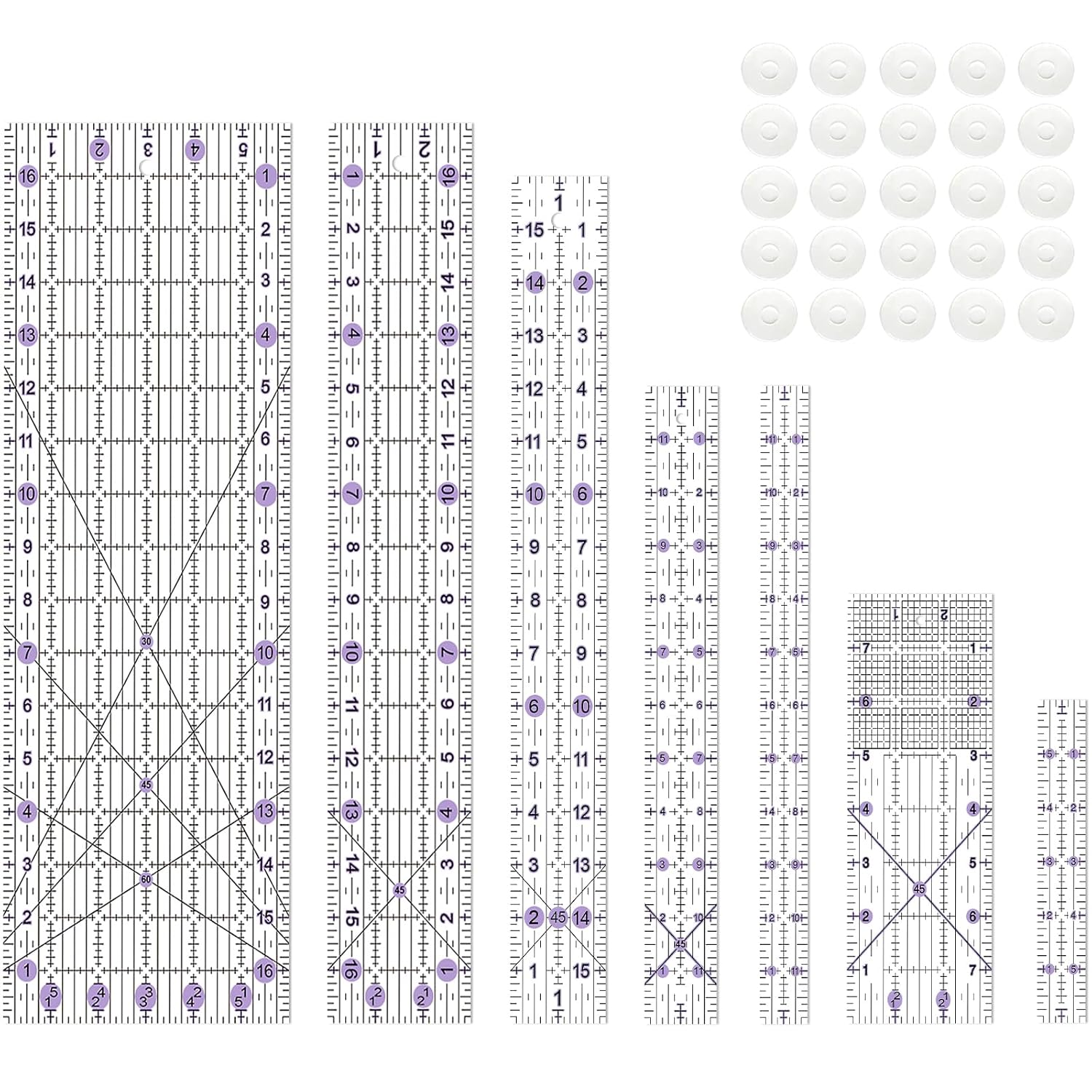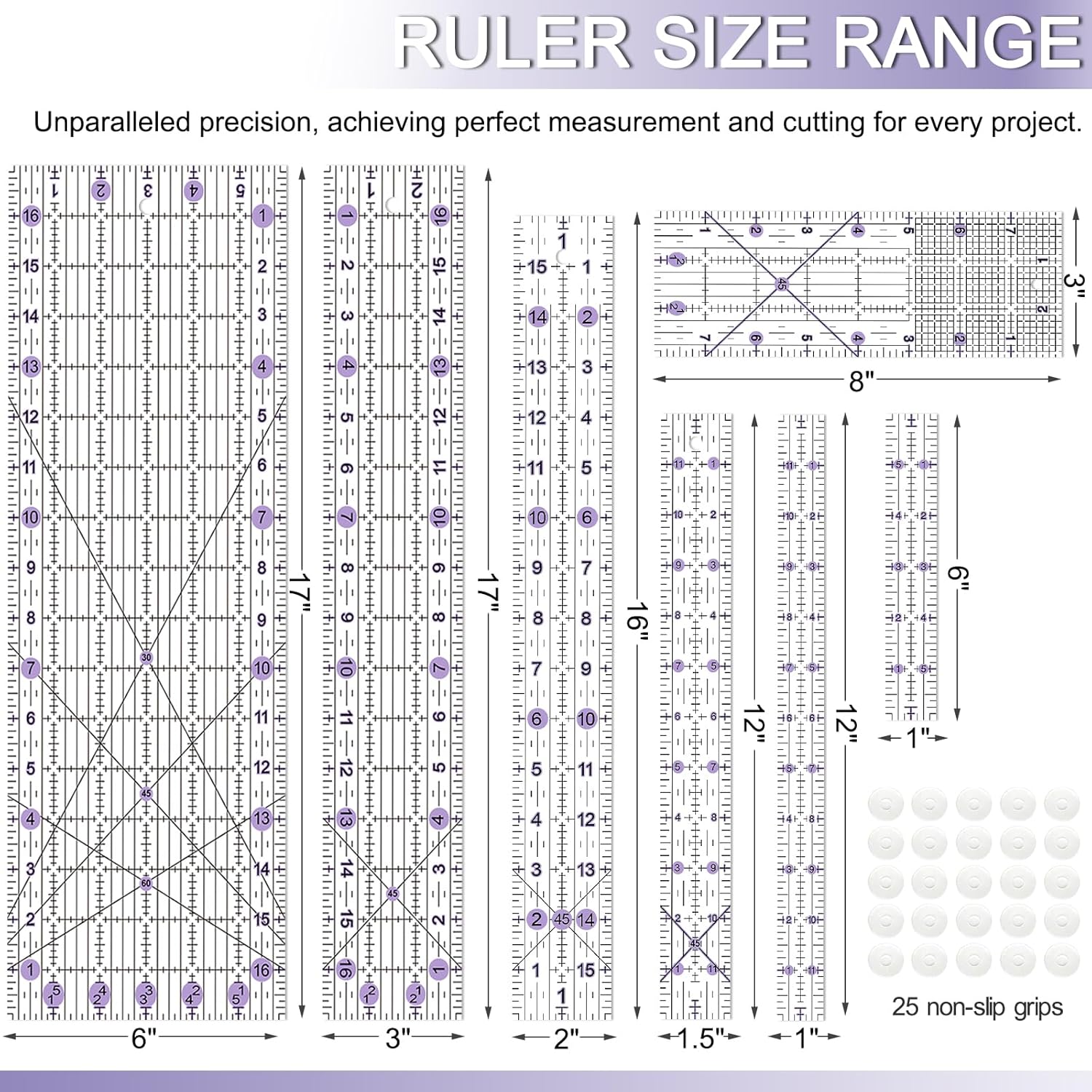 Quilting Ruler, Sewing Ruler, 8 Pack, Acrylic Quilting Templates(6"x17", 3"x17", 2"x16", 1.5"x12", 1"x12", 1"x6", 8"x3"), Non Slip Rings 25 Pieces, Sewing and Quilting Supplies - Clear/Purple