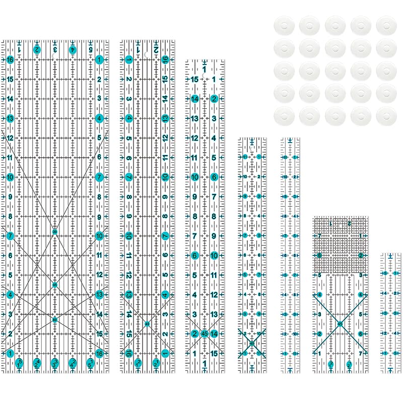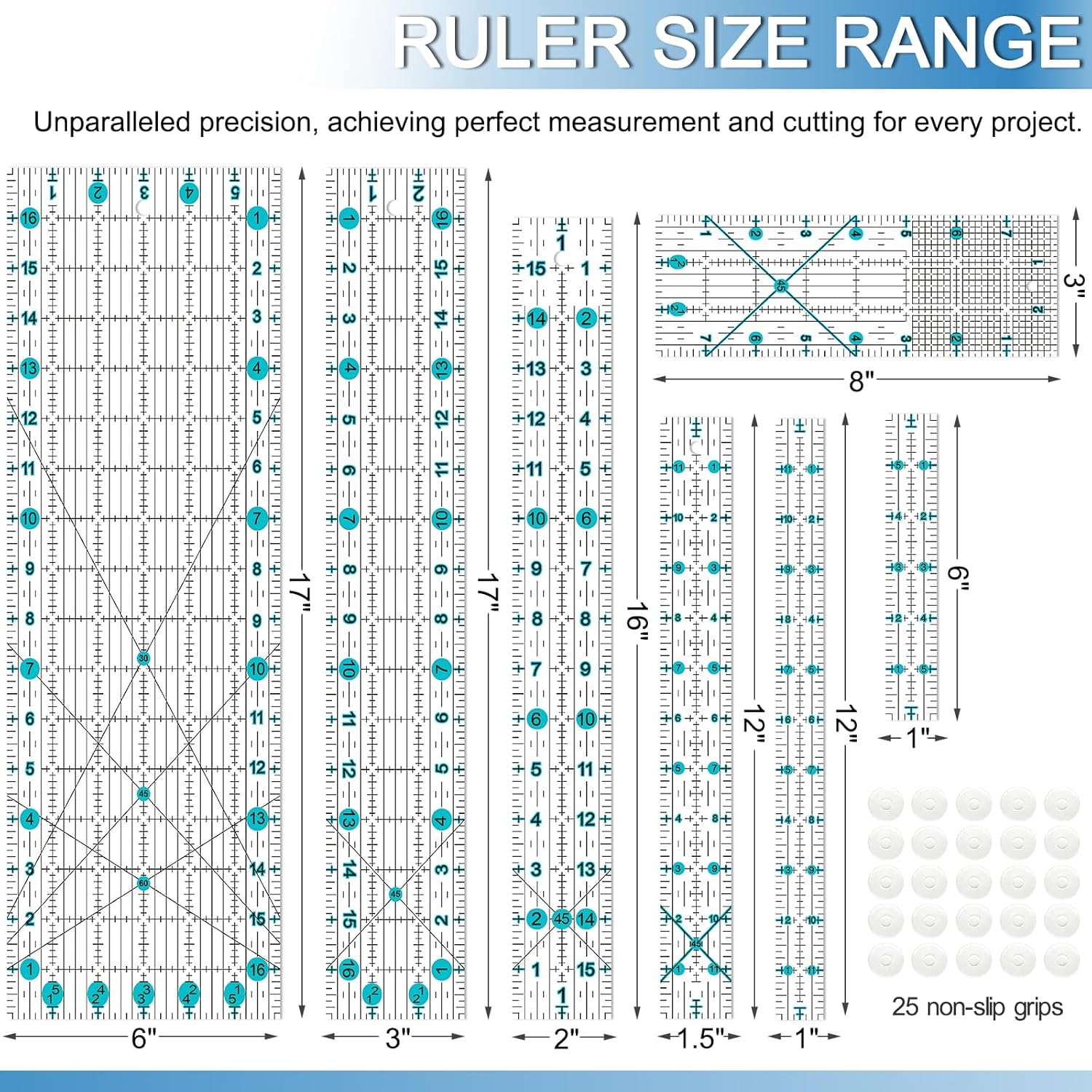 Quilting Ruler, Sewing Ruler, 8 Pack, Acrylic Quilting Templates(6"x17", 3"x17", 2"x16", 1.5"x12", 1"x12", 1"x6", 8"x3"), Non Slip Rings 25 Pieces, Sewing and Quilting Supplies - Clear/Blue