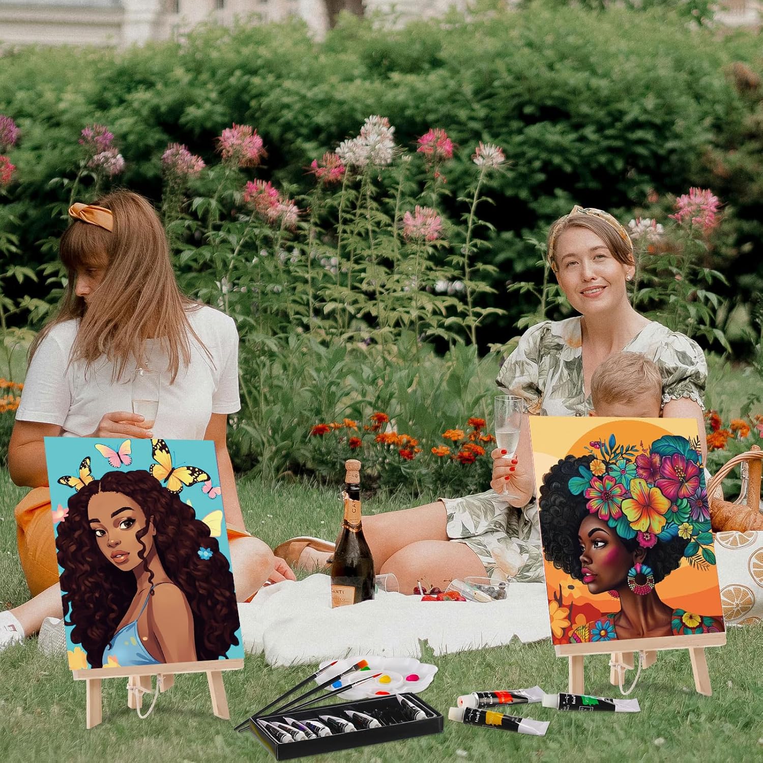 Cholemy 36 Pcs Paint and Sip Kit for Adults 8''x10'' Pre Drawn Canvas for Painting DIY Afro Acrylic Painting Kit Wood Easel Brushes Date Night Bulk for Christmas Party Gifts(Flowers Woman)