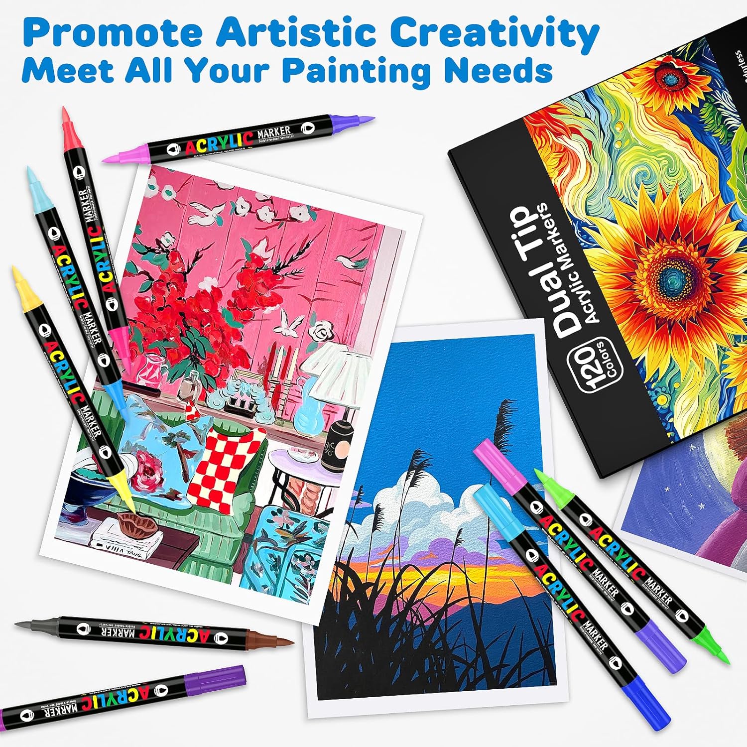 120 Colors Acrylic Paint Markers, Dual-Color Acrylic Paint Pens with 60 Brush Tips for Fabric Rock Wood Glass Paper DIY for Painting, Quick Drying, School Art Supplies for Adults Kids Drawing