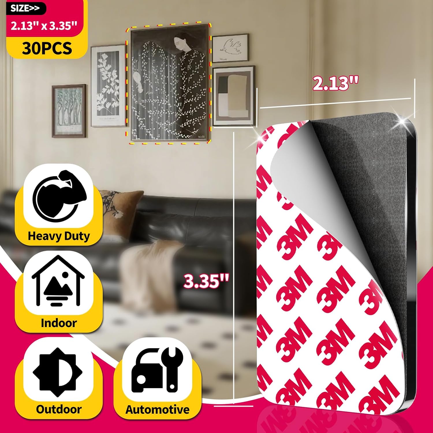 30 Pcs Large Strong Double Sided Adhesive Pads, Made of 3M, Heavy Duty Square Sticky Mounting Foam Tape for Car Décor Wall, 0.12" Thick Black Sticky Pads 2.13" x 3.35"