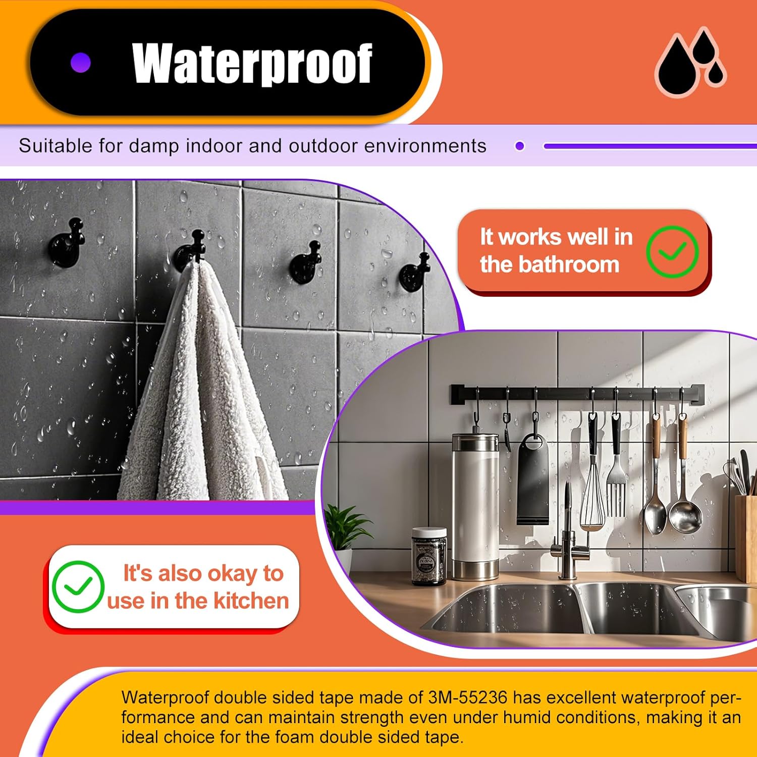 - 【Waterproof】Waterproof double sided tape made of 3M-55236 has excellent waterproof performance and can maintain strength even under humid conditions, making it an ideal choice for the foam double sided tape. Suitable for installing shampoo bottles, showerheads, hooks, and other damp indoor and outdoor environments such as bathrooms, kitchens, and others.
