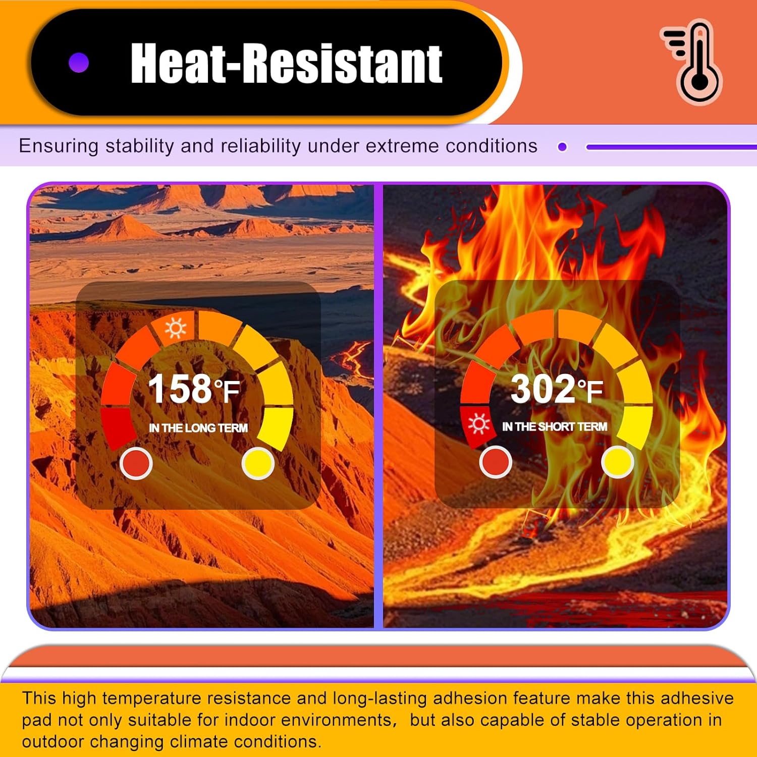 - 【Super High Temperature Resistance】Heavy duty double sided mounting tape has excellent high temperature resistance, capable of withstanding temperatures up to 302 ℉ (150 ℃) in the short term, ensuring stability and reliability under extreme conditions. At the same time, it maintains strong adhesion under long-term temperatures of 158 ℉ (70 ℃). This high temperature resistance and long-lasting adhesion feature make this adhesive pad not only suitable for indoor environments, but also capable of stable operation in outdoor changing climate conditions, demonstrating excellent strong adhesion and durability.