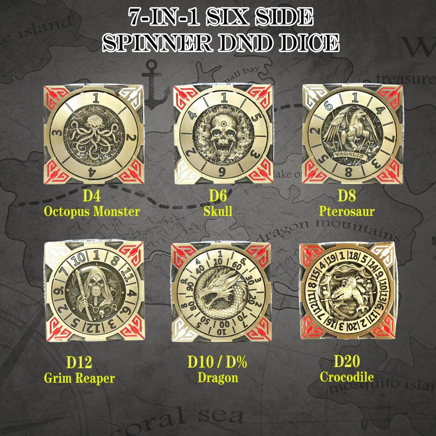 - All in One Multi-functional Design: This DND Dice integrates the functions of d4, d6, d8, d10, d10%, d12, and d20 into one die. Each face features exquisite engravings like octopus, skull, eagle, grim reaper, crocodile, and dinosaur, adding artistic flair and making it a standout piece on your gaming table.