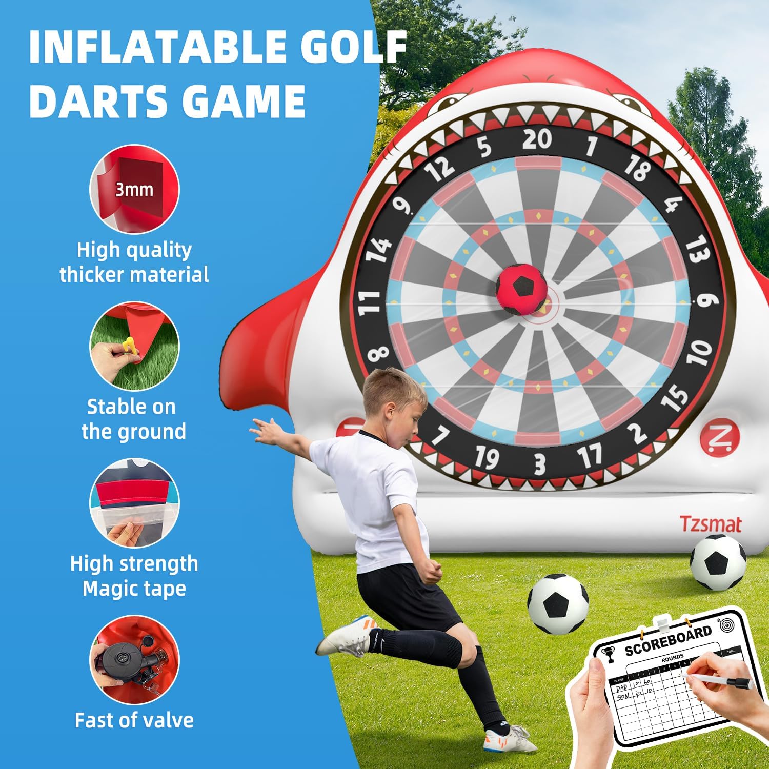 - Outdoor Games for Families: The soccer blow up inflatable dart board inflates over 7.5ft tall. withing the electric air pump, you can inflate the inflatable dartboard within 10 mins. You do not need to waste time at your yard soccer game with the fast of the valves system. Good giant games can make you have a good family time.