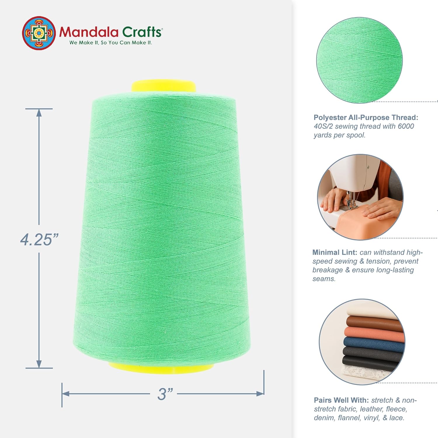 - Bulk Seafoam Green Polyester Serger Spools Thread Sewing Supplies Kit: Each 4.25 x 3 x 3 in cone of thread is 6000 yards long. The 40wt all-purpose sewing thread serve as heavy duty cone serger thread for sewing machine for both residential and commercial use.
