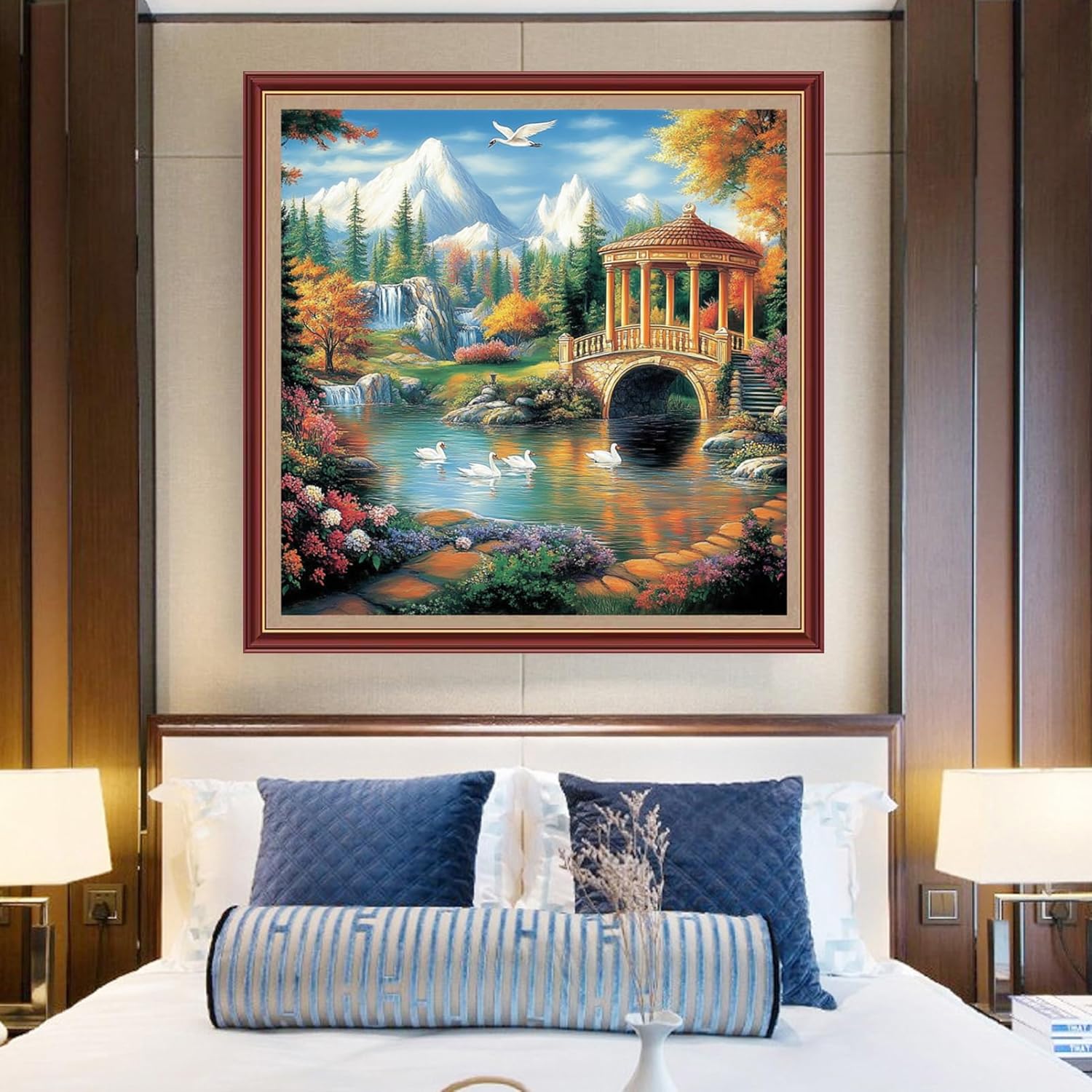 DMCXART Counted Cross Stitch Kits for Adults Needlepoint Kits Unprinted Cross Stitching Embroidery Kit 11CT Cross Stitch Supplies-Swan Lake Scenery 18x18 inch