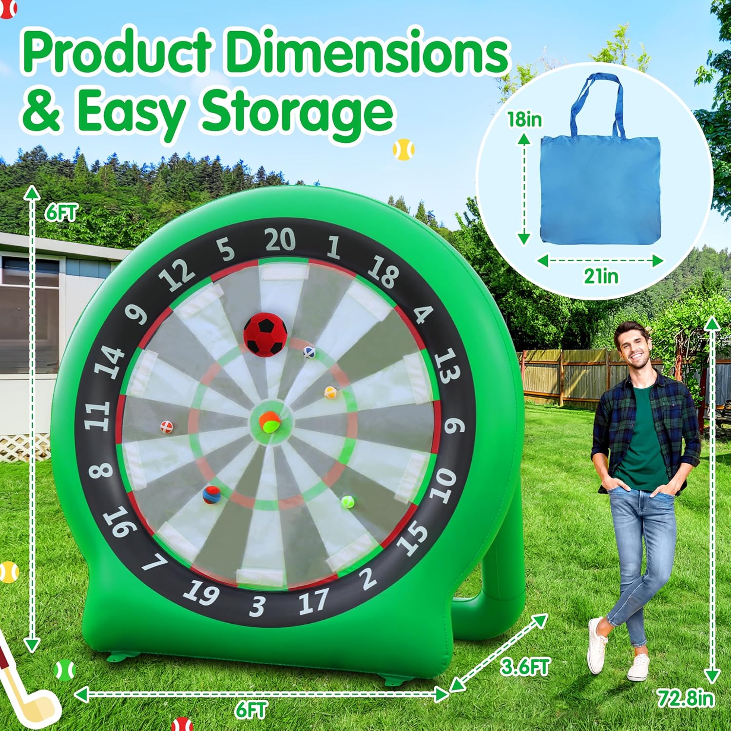 - All-in-One Accessories: The box comes with everything you need: 1 giant dart board, electric pump, soccer pump, chipping mat, scoreboard, 4 ground stakes, 2 repair patches and a carry bag. Whether you're practicing golf or hosting a soccer darts event, just inflate, stake (outdoors), and play