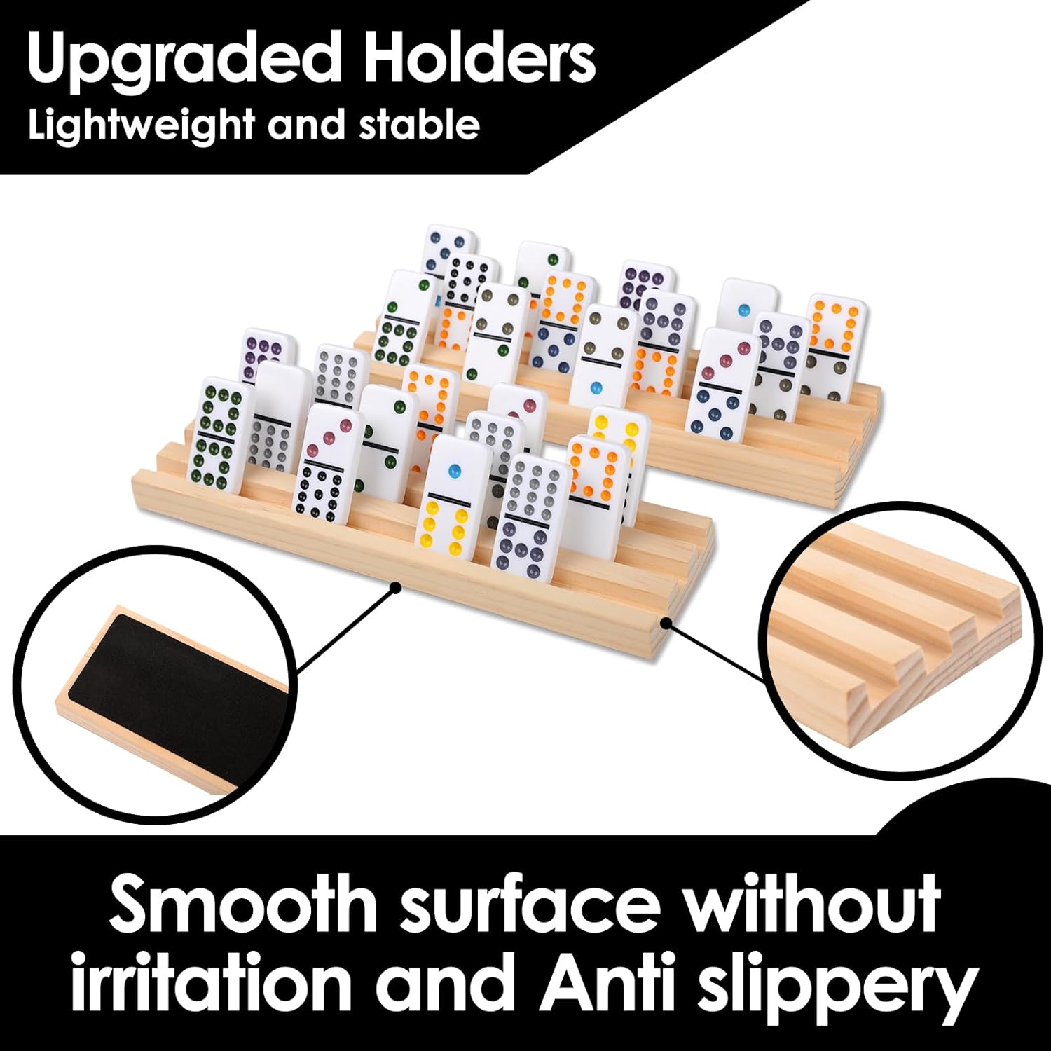 - 8 Wooden Holders: This set includes 8 solid wood holders, each with 3 angled slots to securely hold domino tiles upright or sideways. Track your game layout effortlessly and plan your movesโno manual adjustments or tile concealment needed