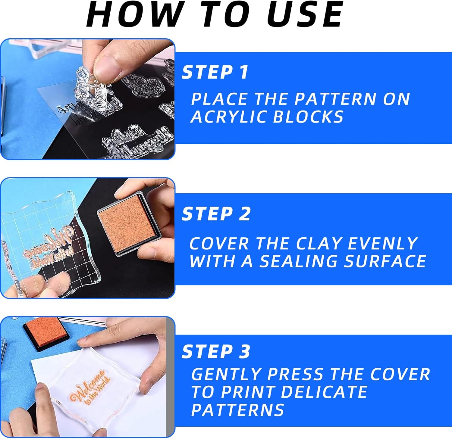 - How to use: Choose the clear acrylic block for stamping you need, peel the stamp block decorative stamp block from the transparent sheet, and apply the ink you like into the stamps, and then paste on the block, the last step to stamp on the paper or card for a while, after air dry, you will get a beautiful pattern; And the stamp block clear acrylic stamping blocks tools set can be cleaned with water