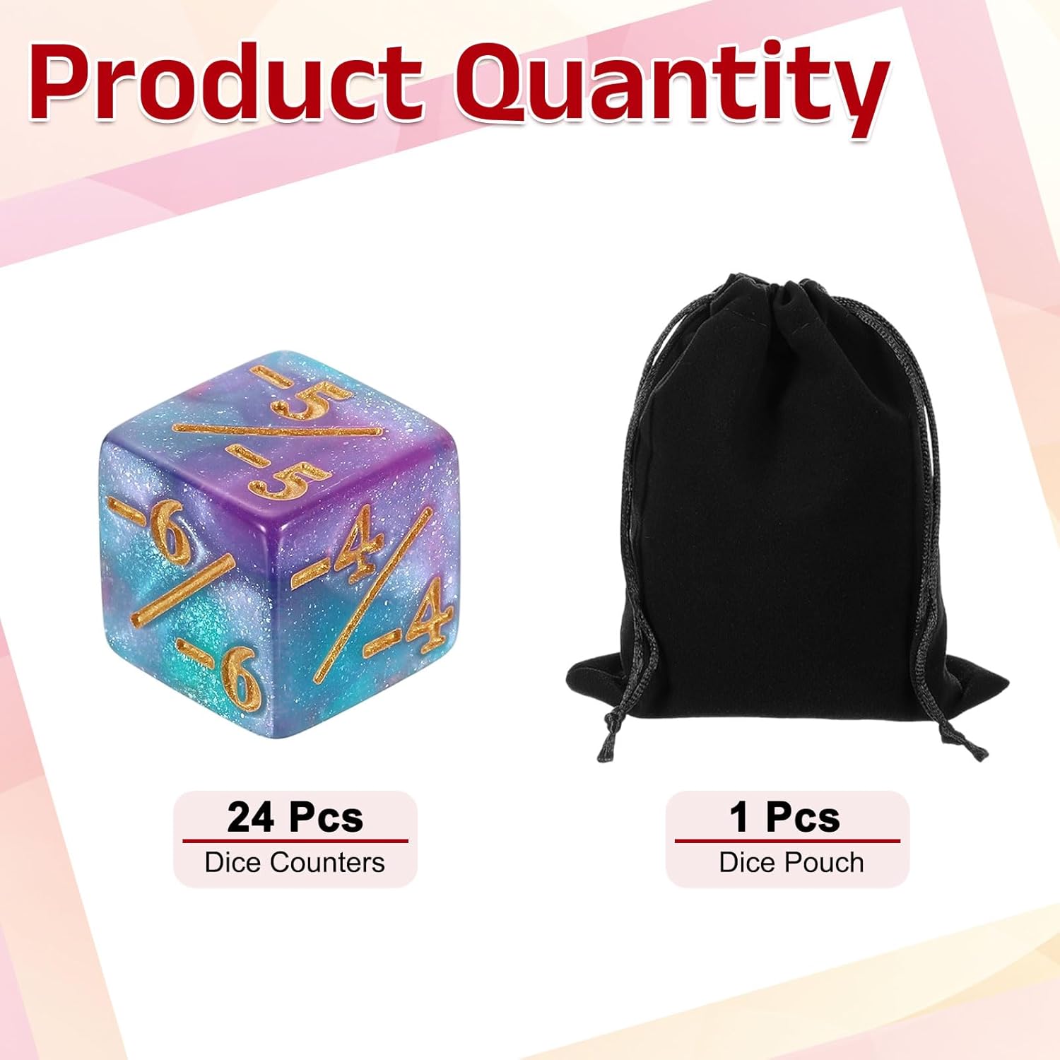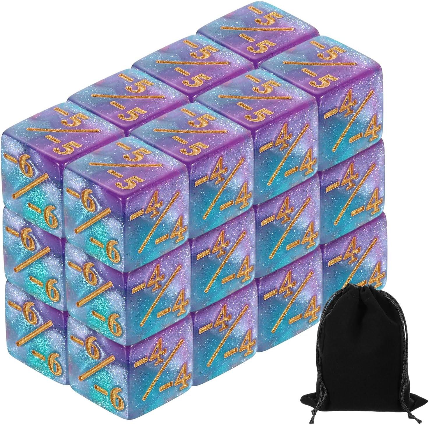 - [Size & Package]: The package comes with 24 pcs of Blue & Purple dice counters with 1 piece of dice pouch, measuring 16 x 16 x 16 mm (0.63 x 0.63 x 0.63 inches), which is the standard D6 size and has enough quantities for your daily game use and replacement