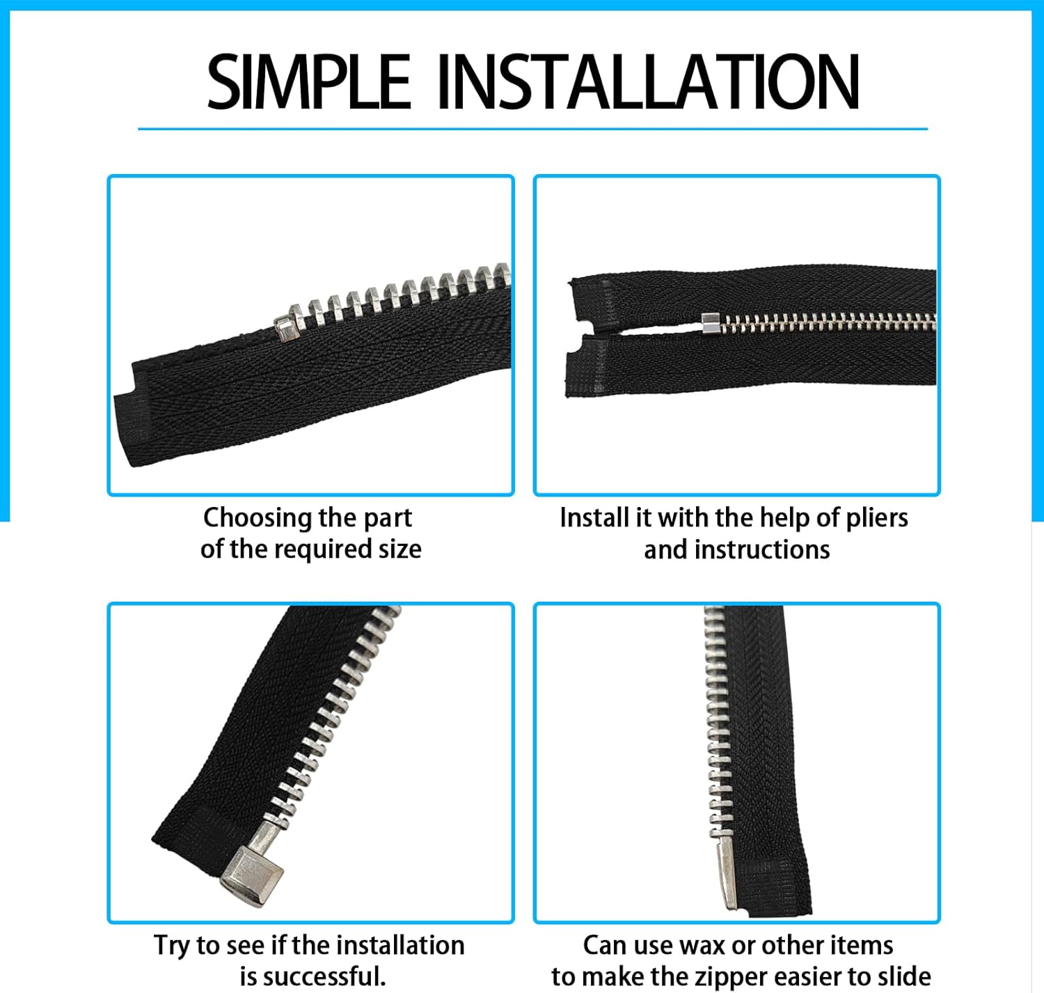 - Easy to Use: Choosing the part of the required size, with the help of pliers, according to the instruction manual or video tutorial, we can easily change the zipper.