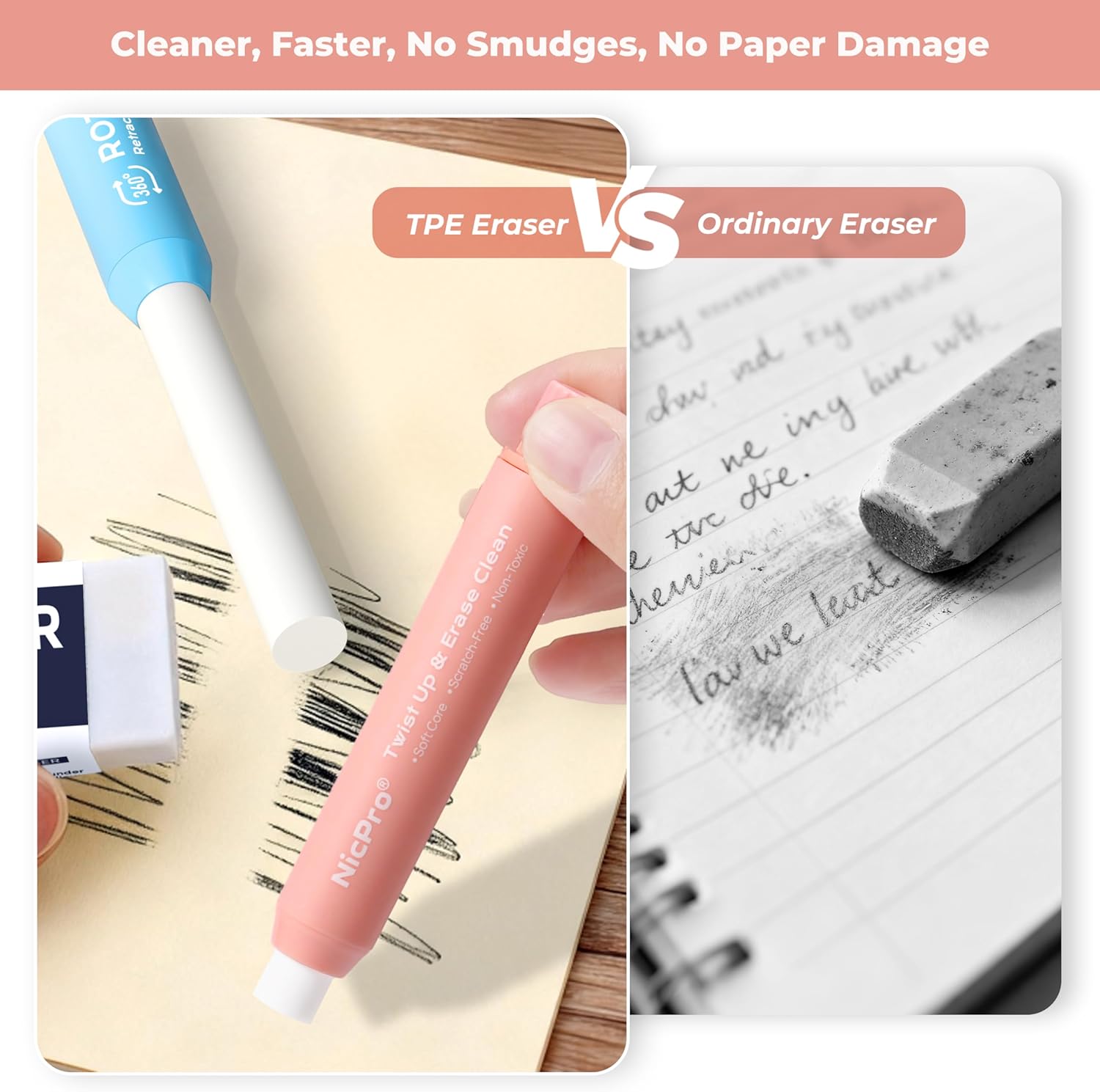 - 【Premium TPE Erasing Power】 – Made from high-grade TPE material, stronger than PVC or TPR erasers, delivering cleaner, faster erasing with less residue and no damage to paper. Perfect for students, artists, and professionals who need precision.