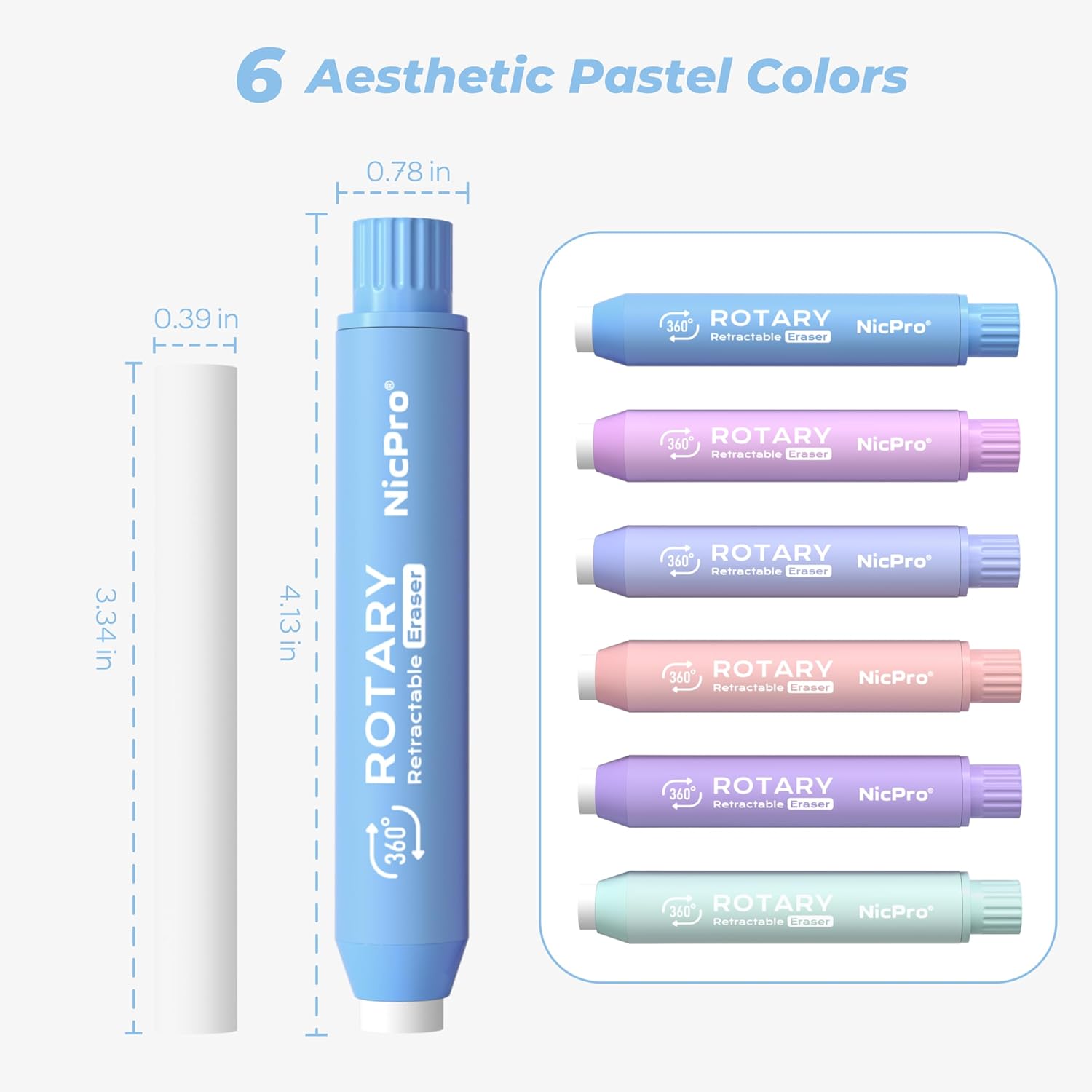 Nicpro 6 Pack Rotary Retractable Erasers Pen Style, Aesthetic Pastel Twist Erasers in Macaron Colors, Clean Erasing TPE Eraser for School Supplies, Office, Drawing & Journaling