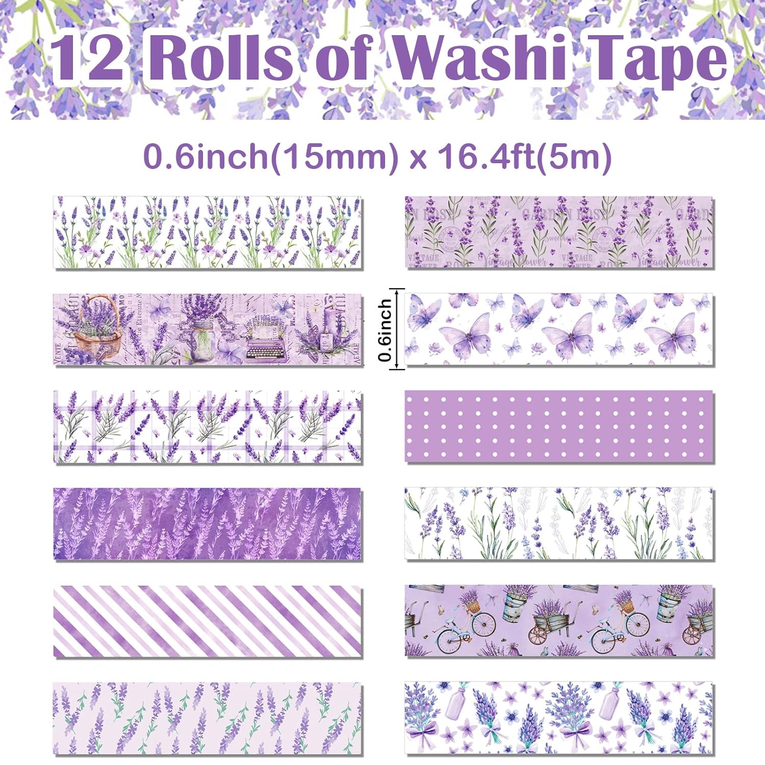 - UNIQUE & EXQUISITE DESIGN: Explore 12 distinct romantic purple elements like lavender sprigs, blooming flowers, vintage bicycles, dots, and butterflies. Perfect for elevating parties, holiday decor, or special events, these tapes infuse every corner of your celebrations with timeless elegance.