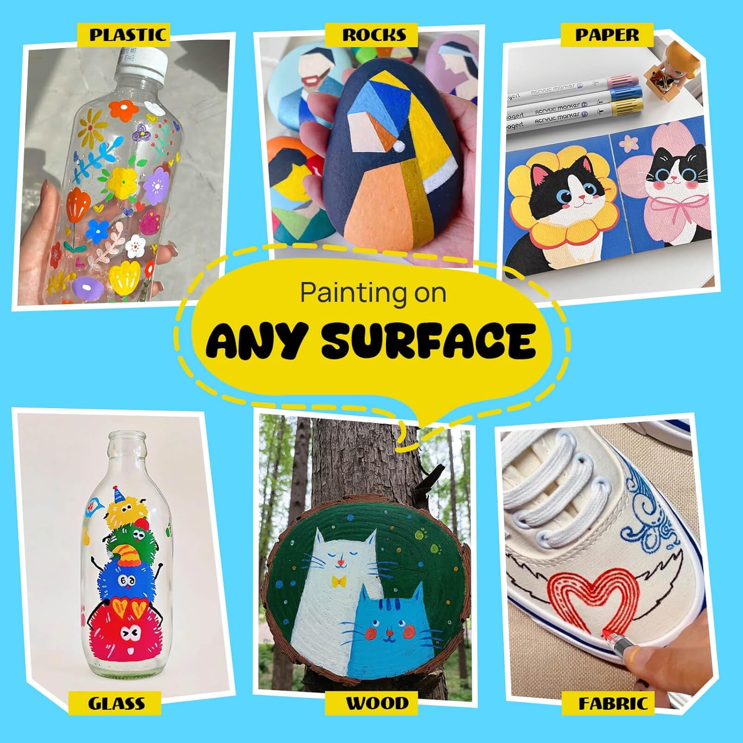 - 【Suitable For Surfaces】 Acrylic markers set suitable for rock painting, fabric, clothes, wood, canvas, ceramic, plastic, stone, metal, resin, shoe, egg, scrapbook, paper, models, porcelain, posters, epoxy, glass paints for glass painting, Halloween pumpkin painting, Christmas ornament, enjoy creating DIY art crafts graffiti projects
