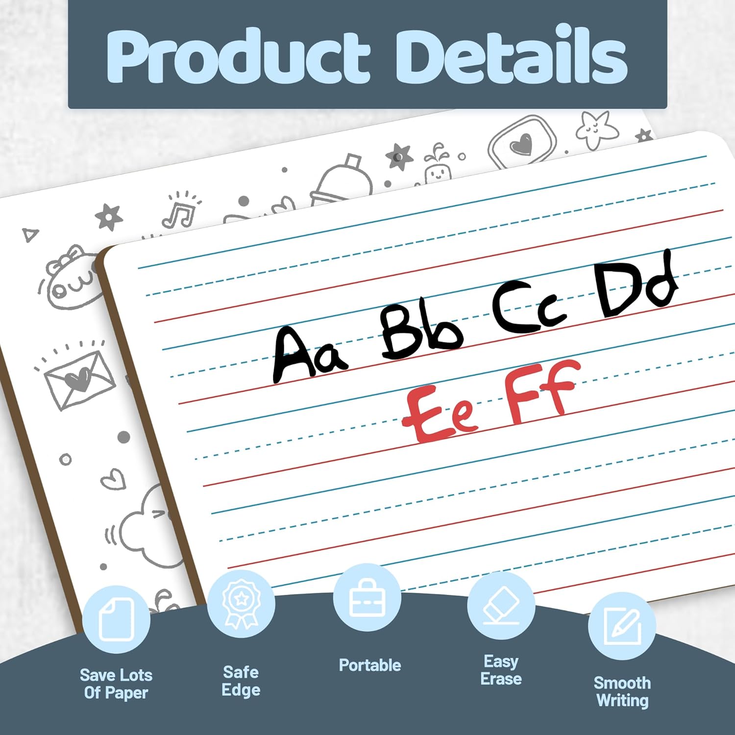 - 【Double Sided Dry Erase Board】The lined whiteboard for kids is perfect for student,and classroom use Use the dry erase boards for kids to practice penmanship or as a dry erase notepad white boards with lines.The LINE side can be used for practicing or learning to write,the BLANK side can be used for various free creations,such as drawing or playing games.