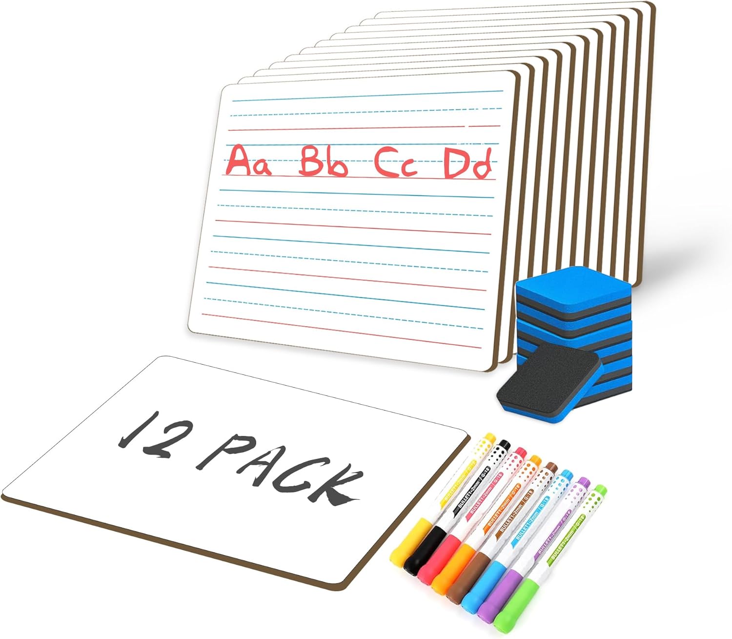 White Board Dry Erase Boards Classroom Pack Mini White Boards 9" x12” Double Sided Personal Whiteboards for Students Teachers School Supplies Lapboards (12Pack line whiteboard & Erasers & Pens)