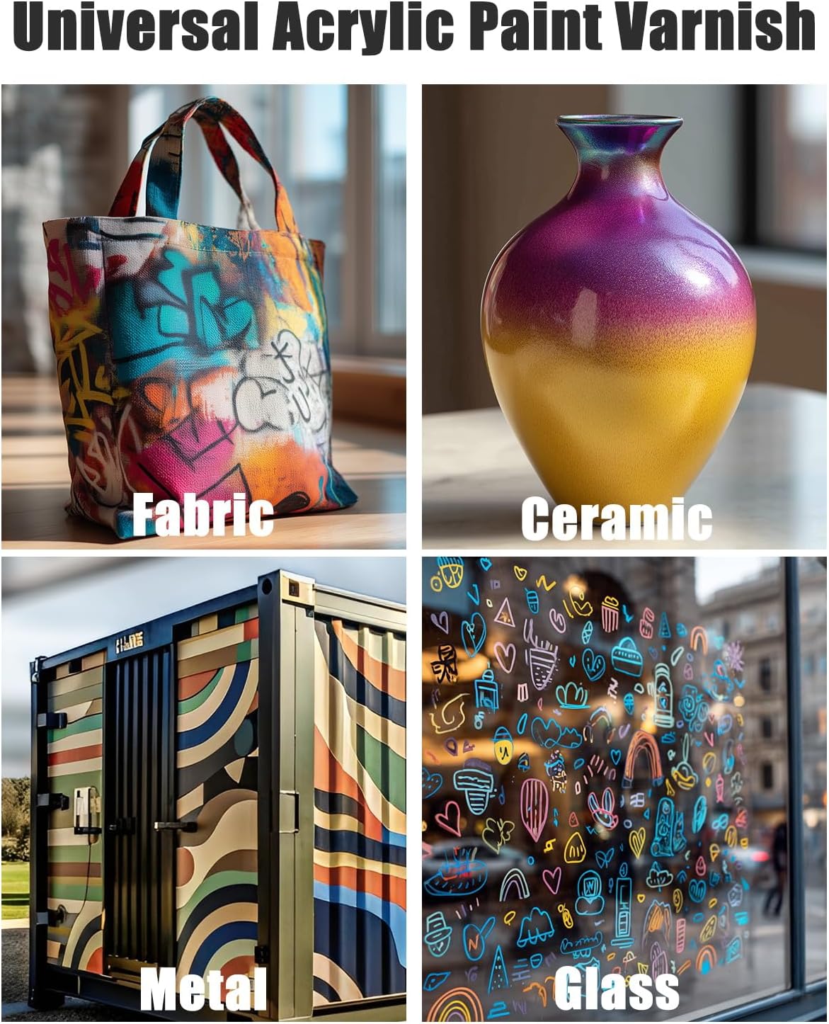 - Dual Application: Apply evenly by spraying or brushing onto acrylic surfaces. Tips: Varnish acts exclusively on dried acrylic paint and provides no protective effect to base materials (e.g., plastic, metal, ceramic)