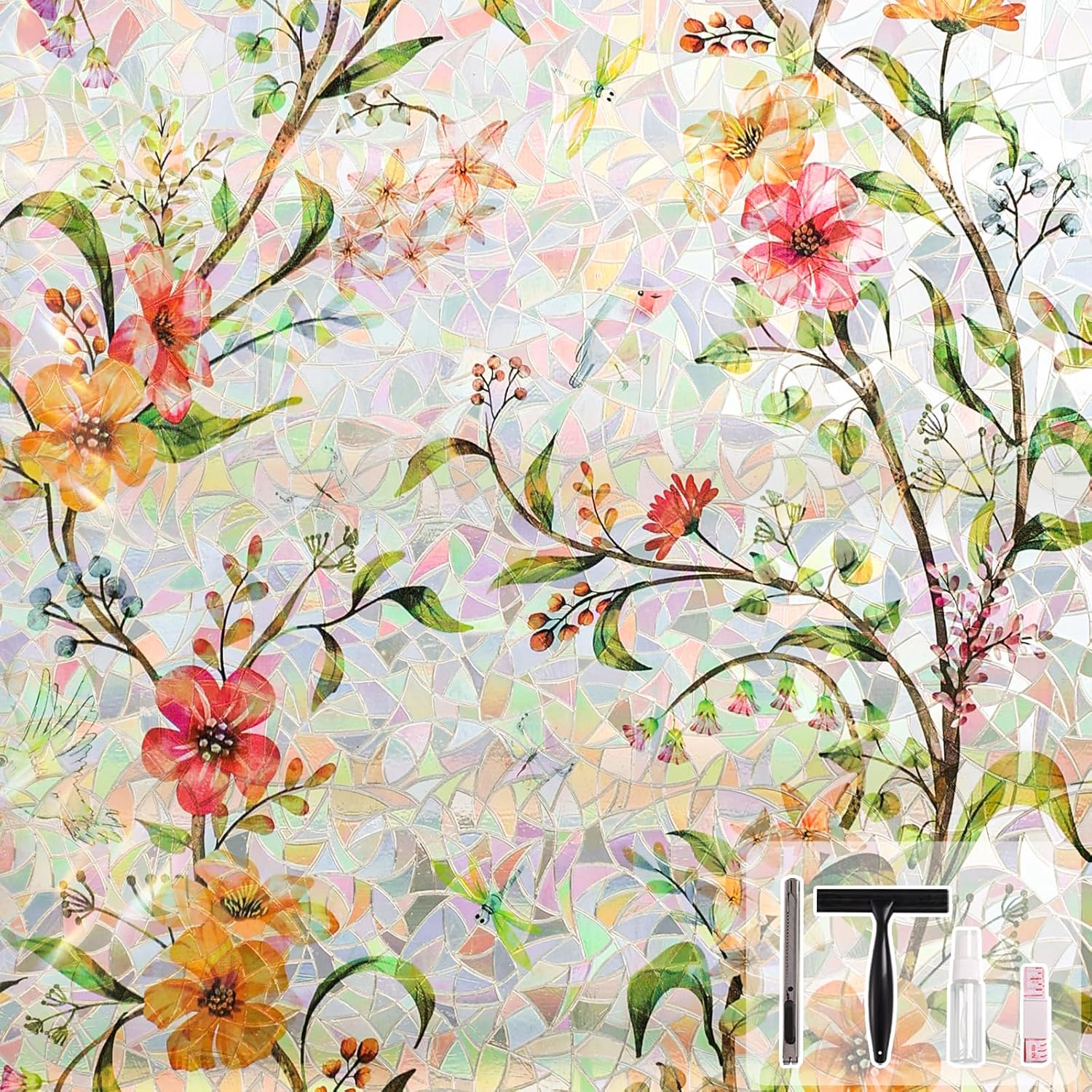 NINETREX Window Privacy Film,Stained Glass Window Film,Rainbow Decorative Stickers Static Cling Anti UV Heat Control for Home Decor (Galsang Flower,23.6 x 157.4inch)